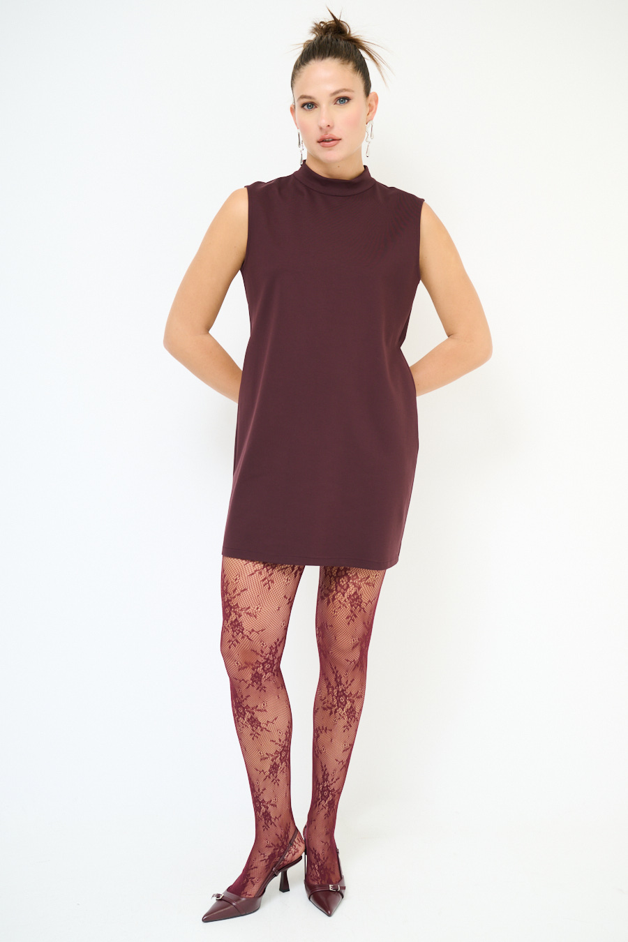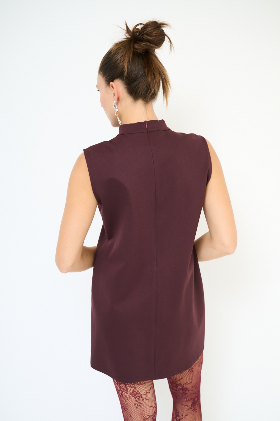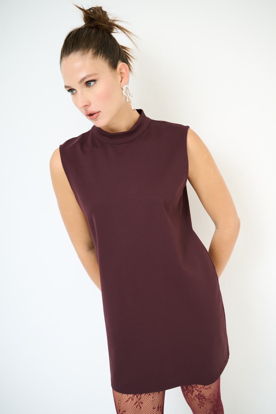 Abito corto smanicato a tinta unita, con colletto e chiusura con zip nascosta sulla schiena.