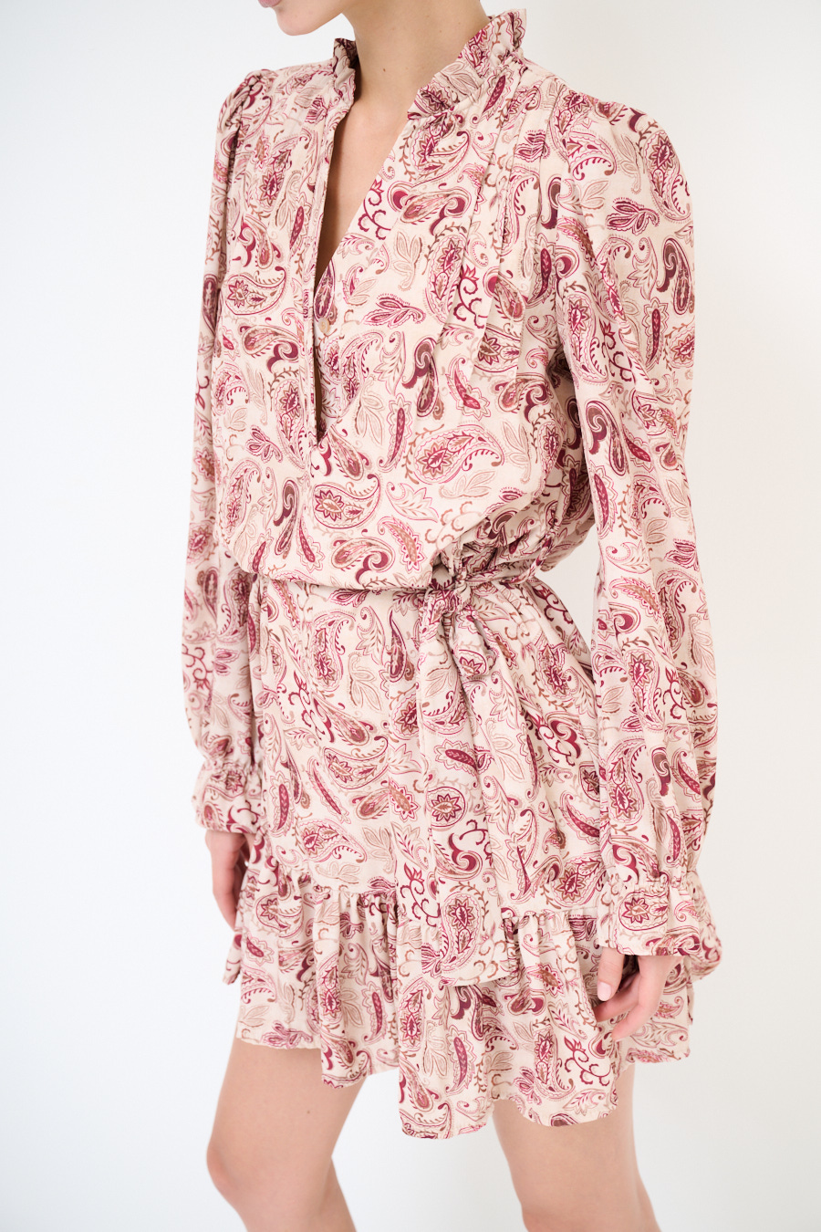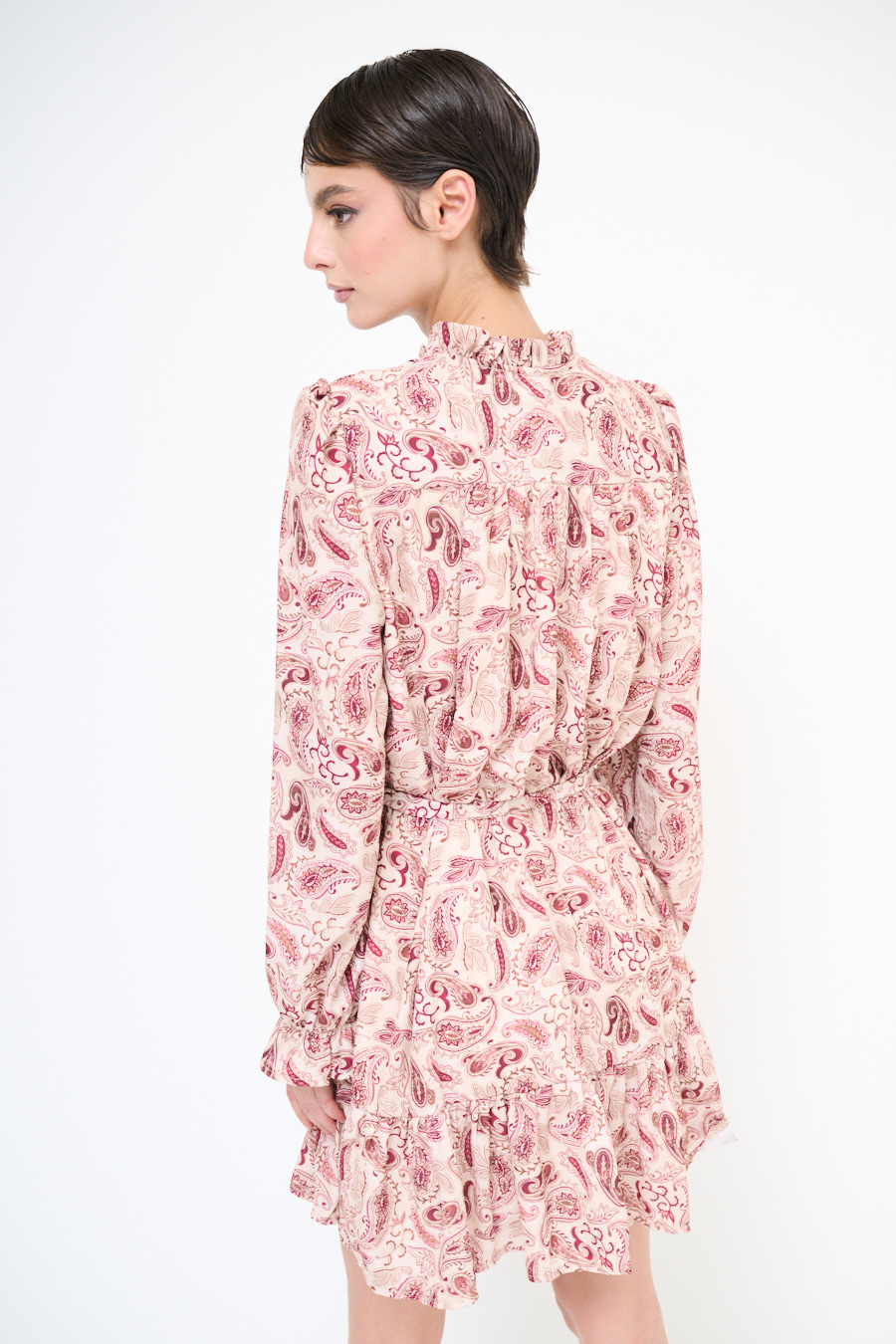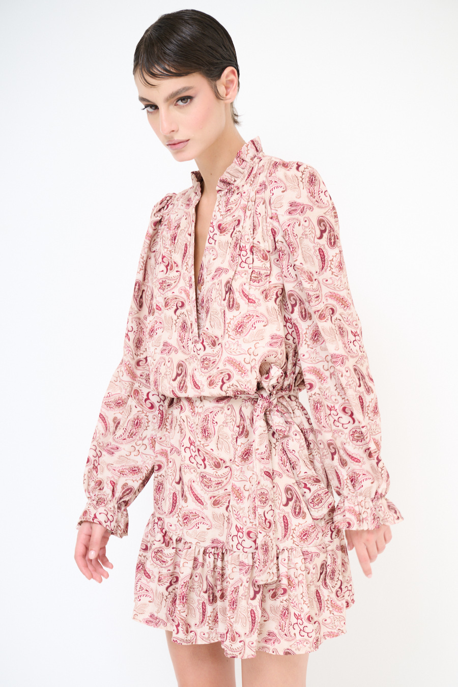 Abito corto in tessuto con stampa cashmere, con balza sul fondo, cintura in vita e abbottonatura a casacca.