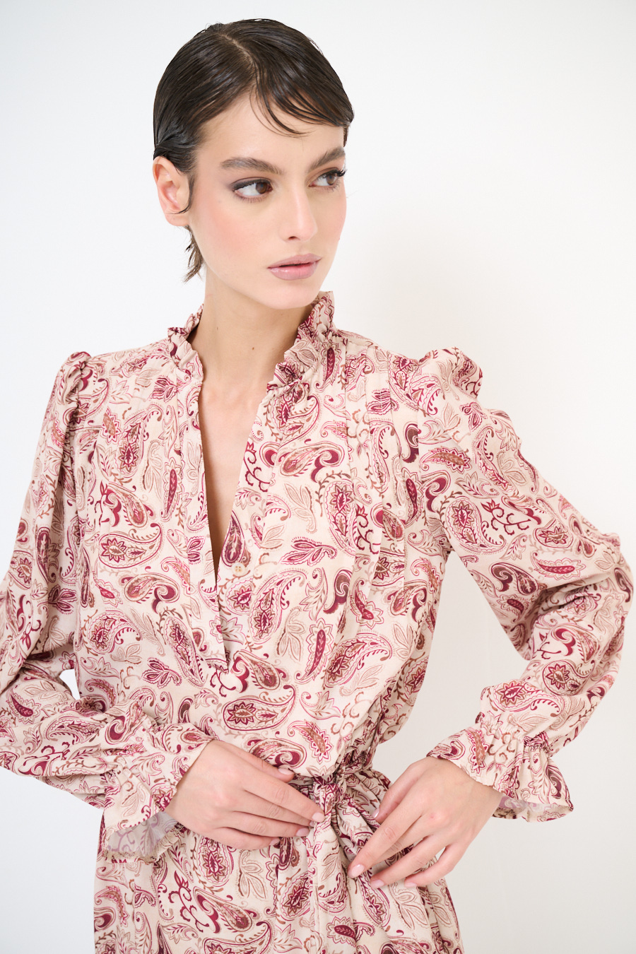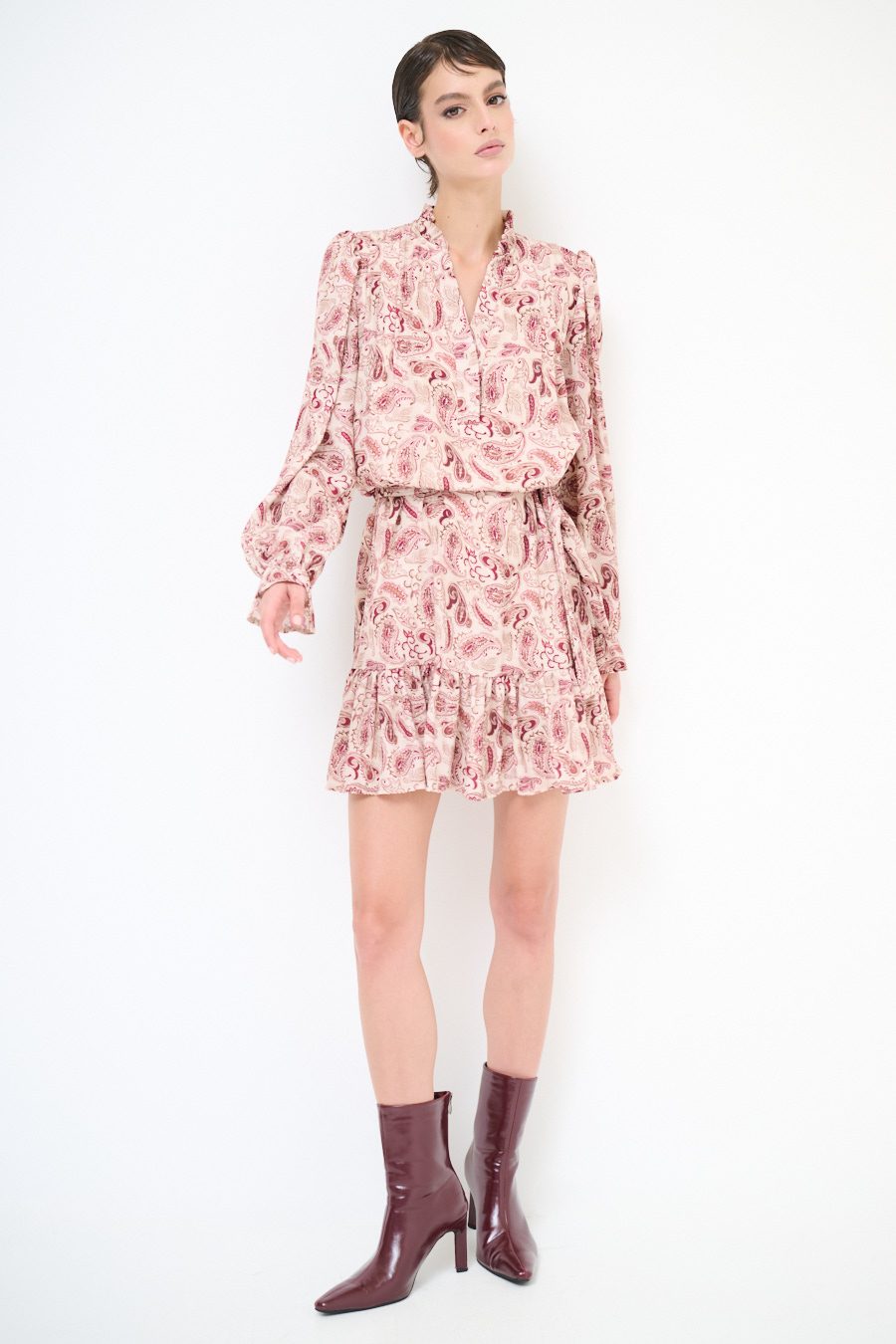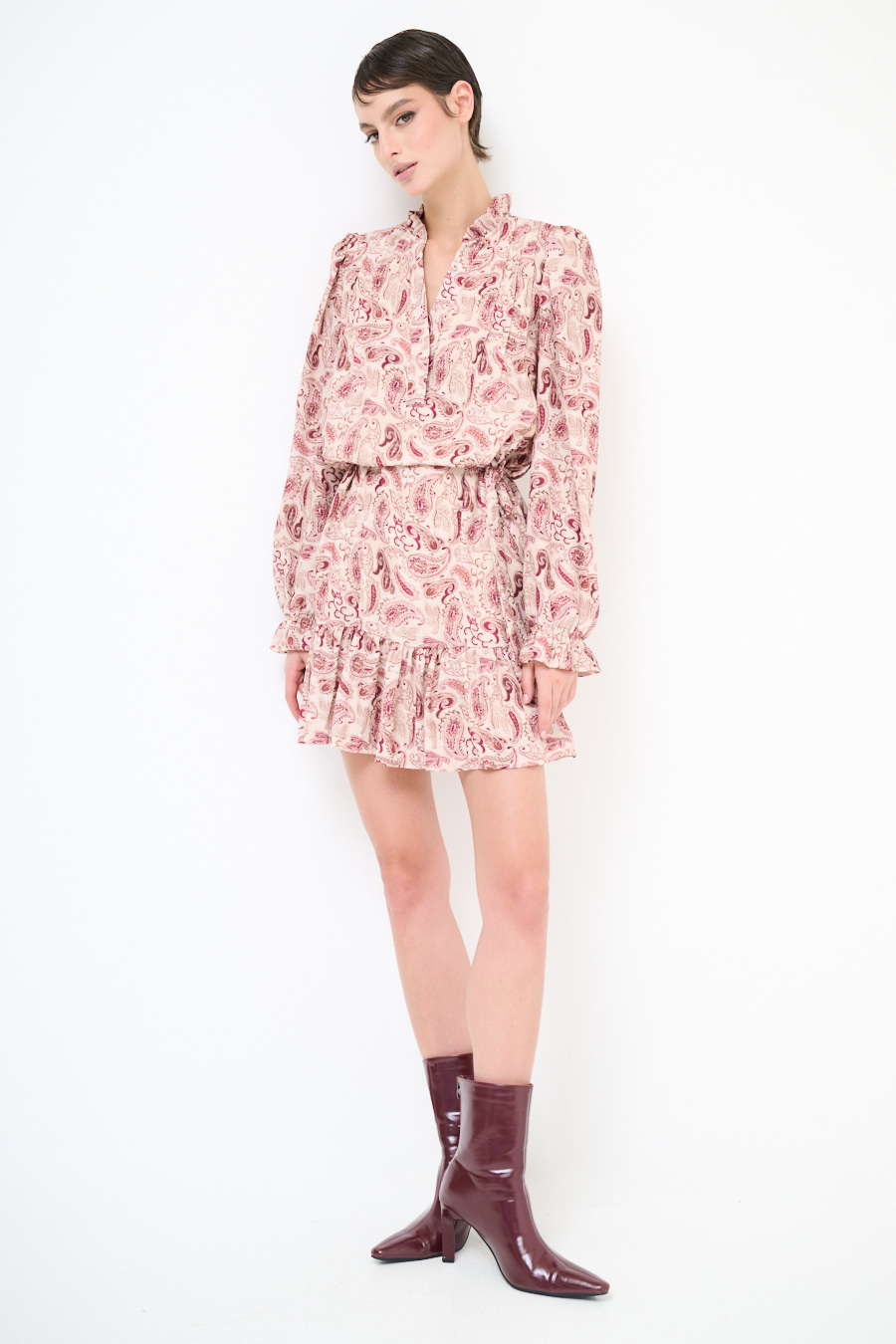 Abito corto in tessuto con stampa cashmere, con balza sul fondo, cintura in vita e abbottonatura a casacca.