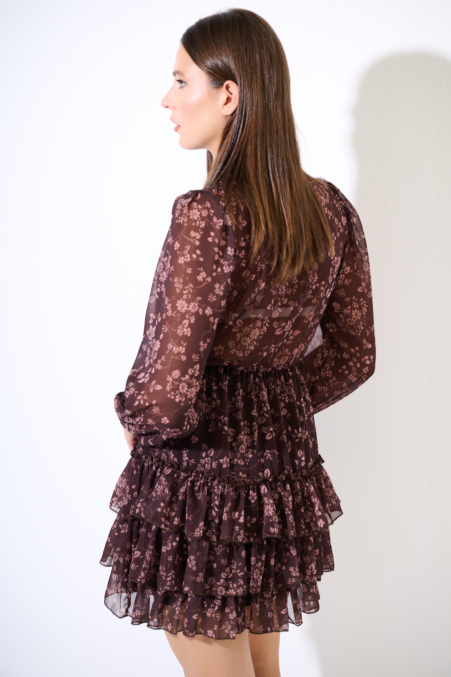 Abito corto a fantasia floreale con doppia balza sul fondo, semitrasparente con fodera interna, e elastico in vita.
