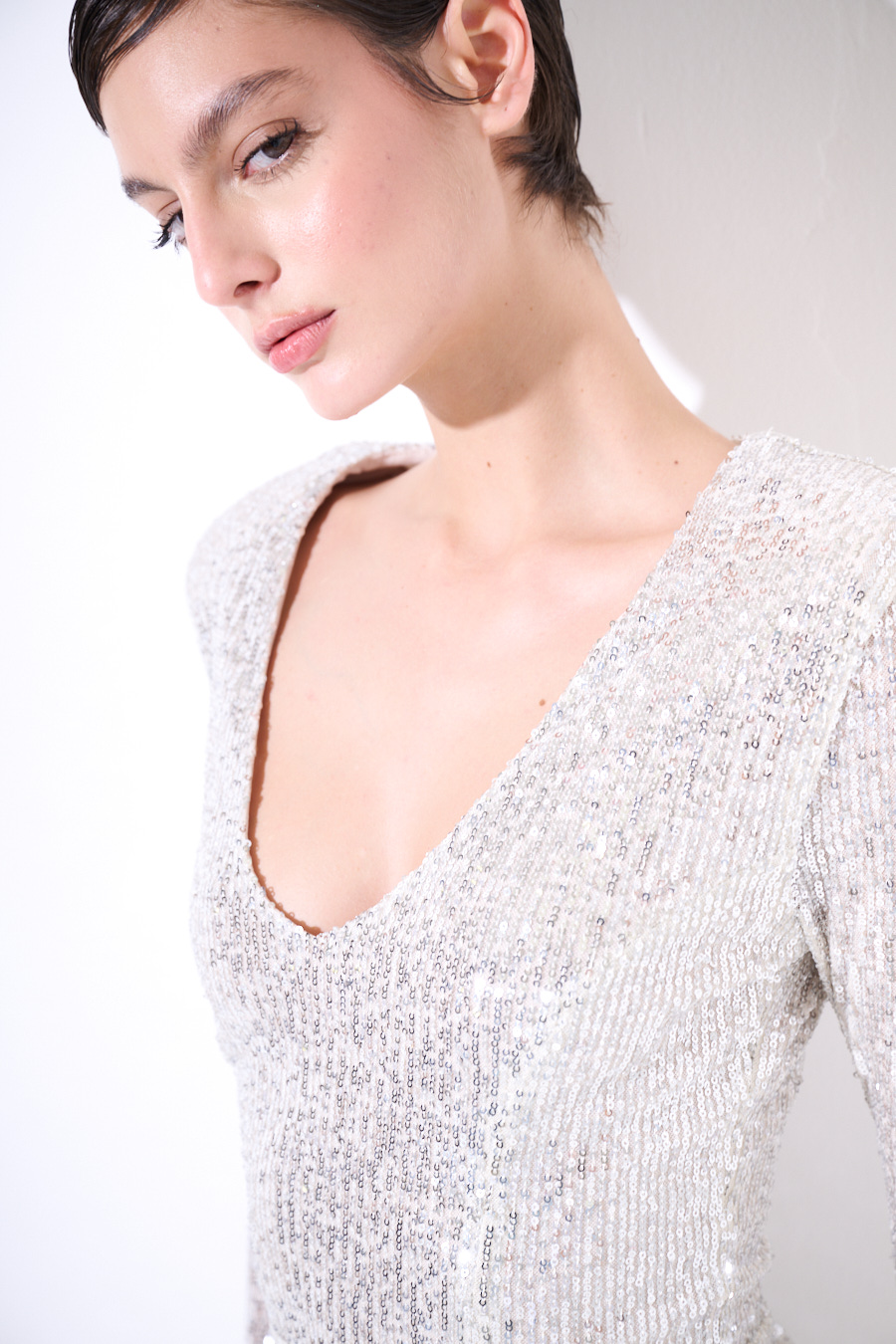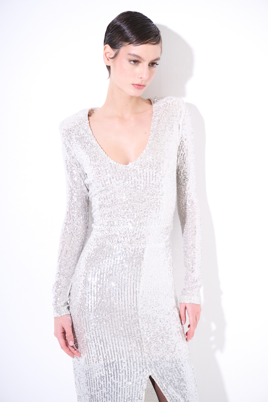 ABITO LUNGO CON SPACCO PAILLETTES ARGENTO