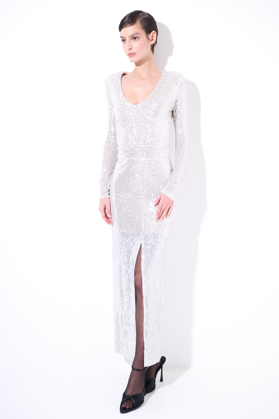 Abito lungo in paillettes con spacco sul fondo, a manica lunga e spalline imbottite.