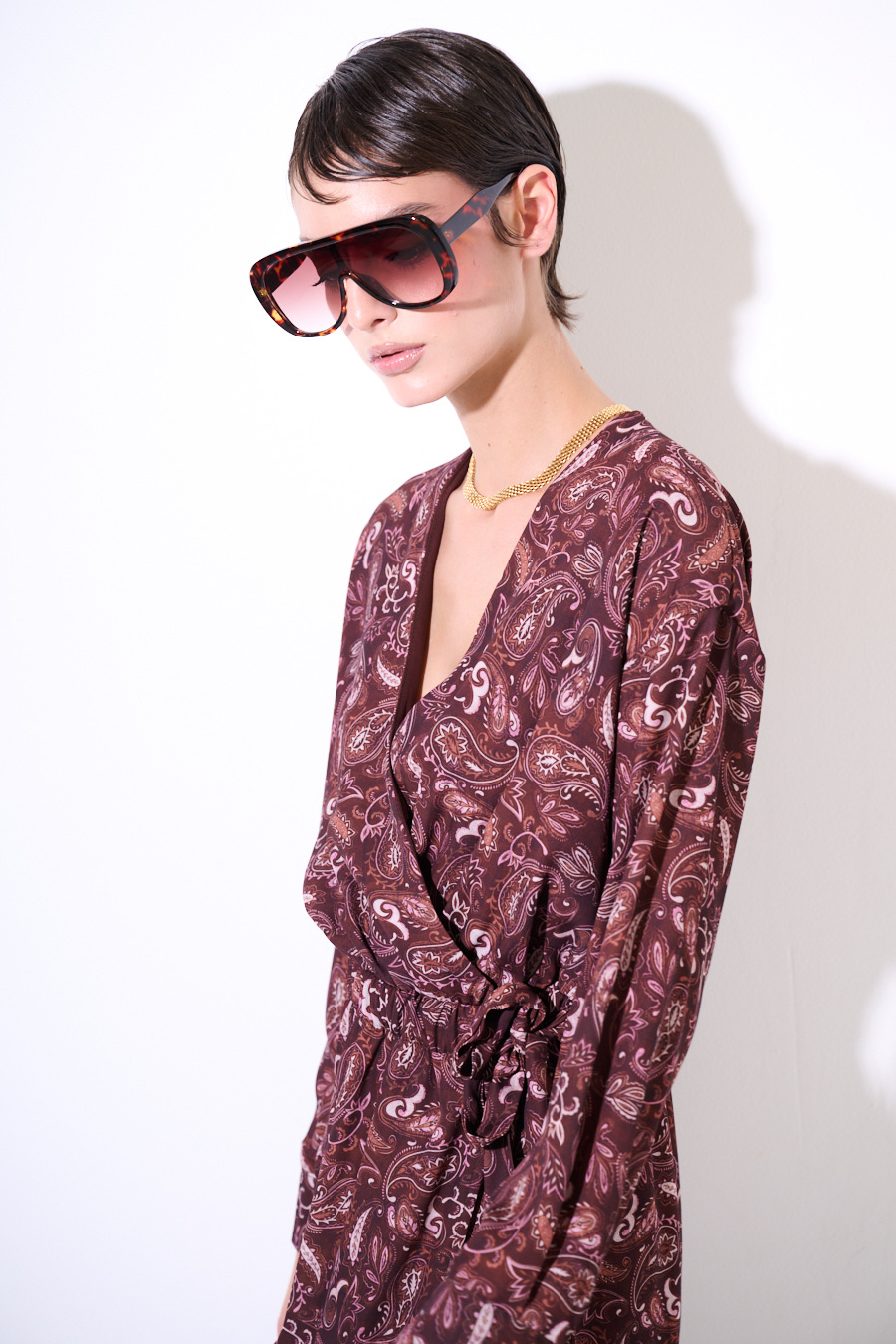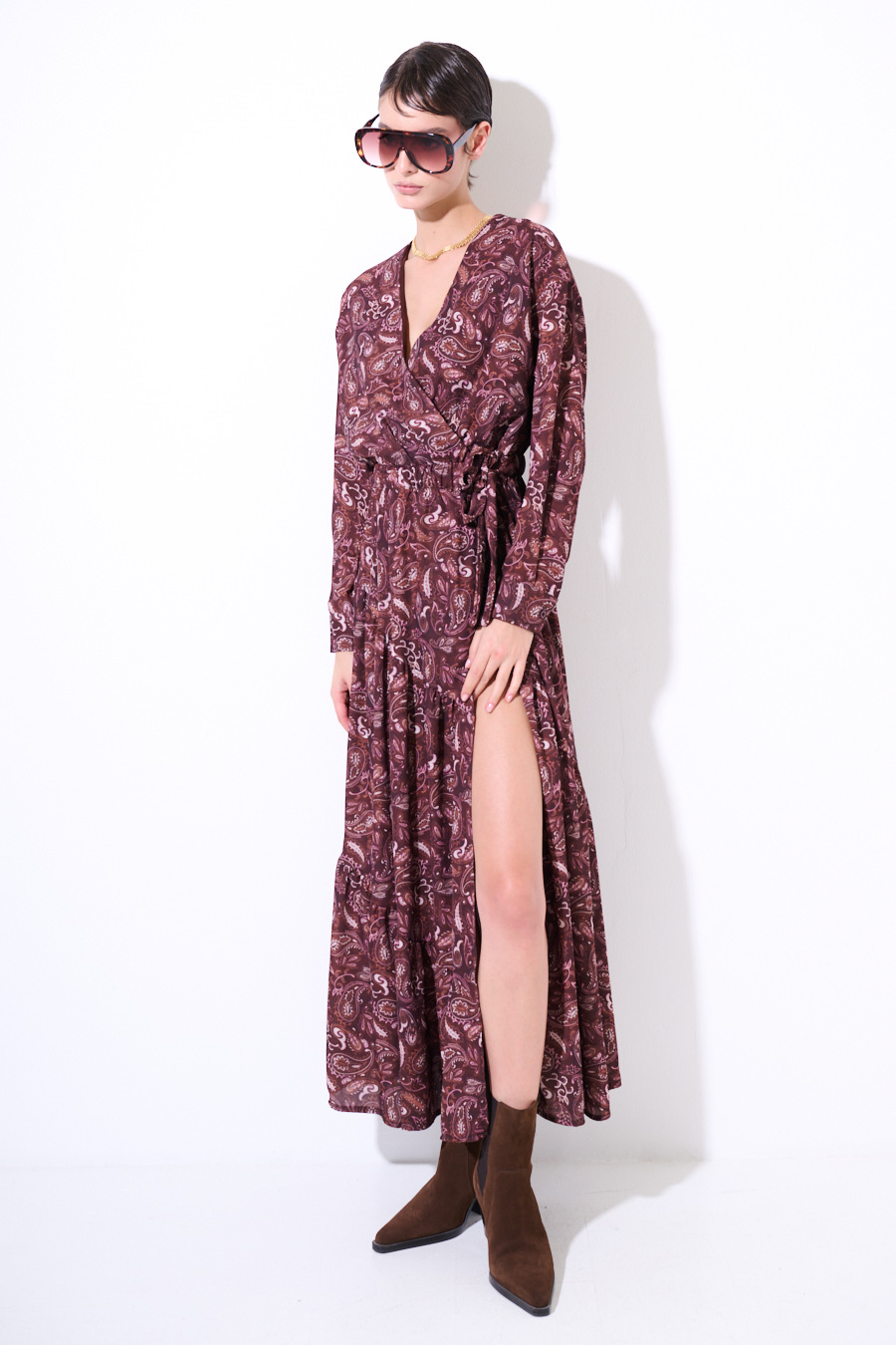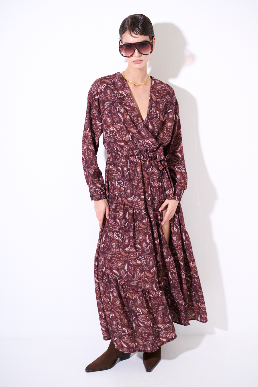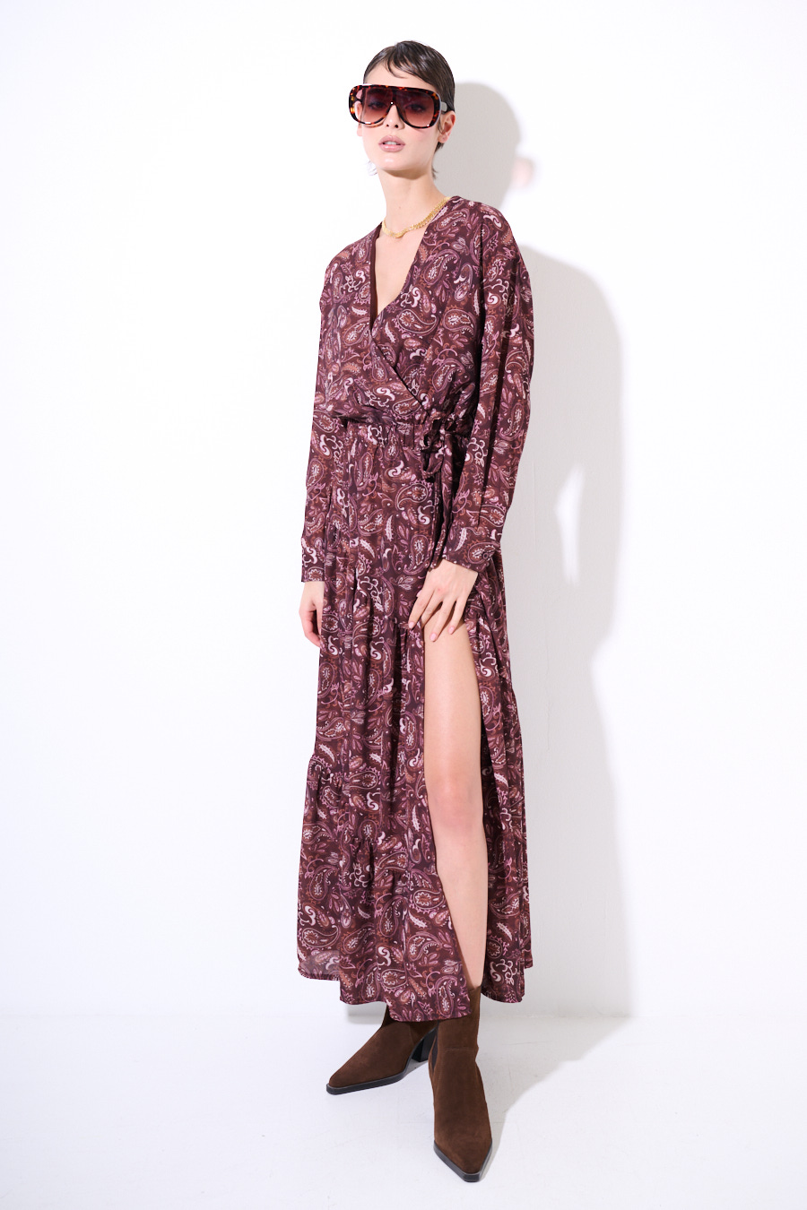 Abito lungo in tessuto con stampa cashmere, balza sul fondo e allacciatura con elastico in vita.