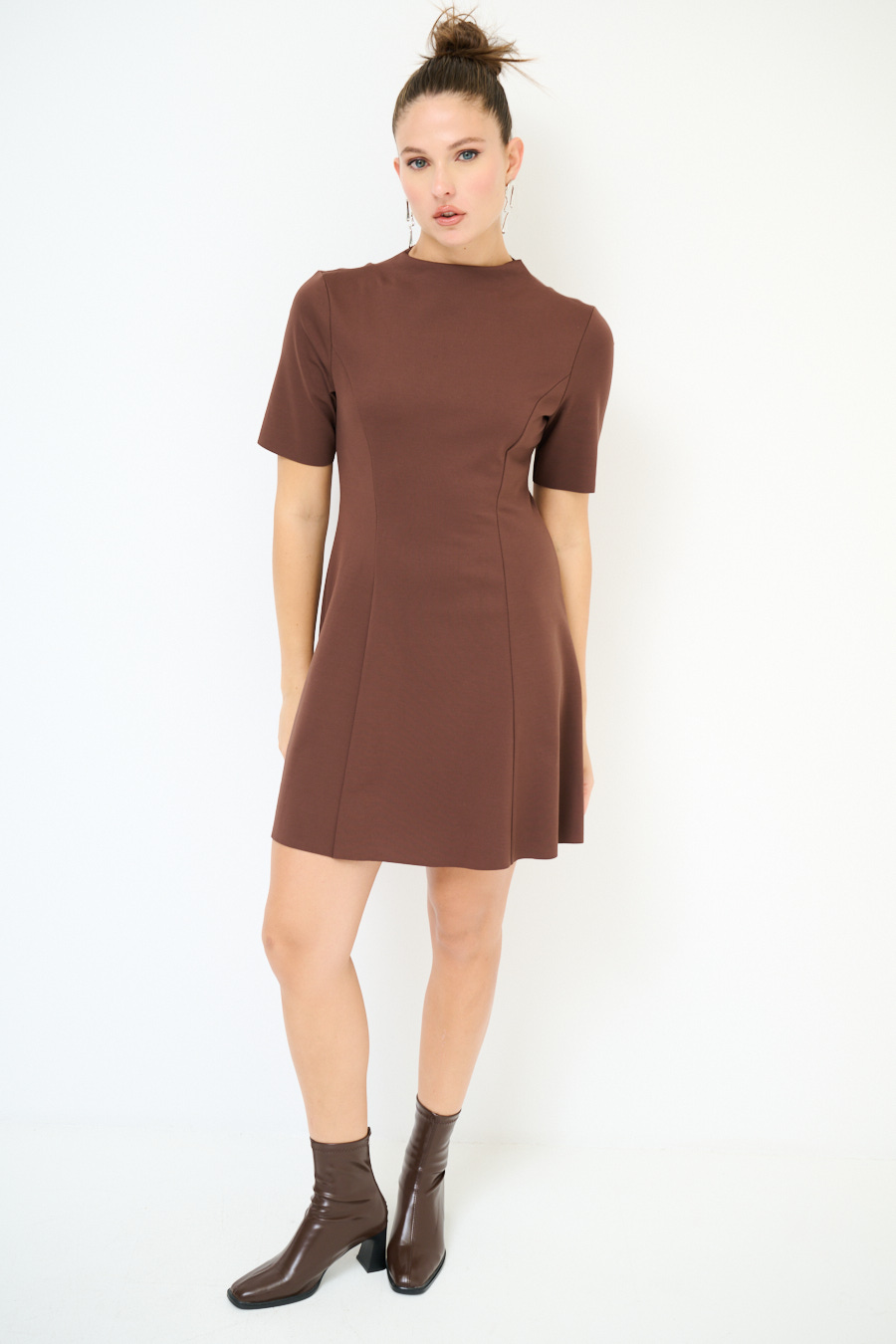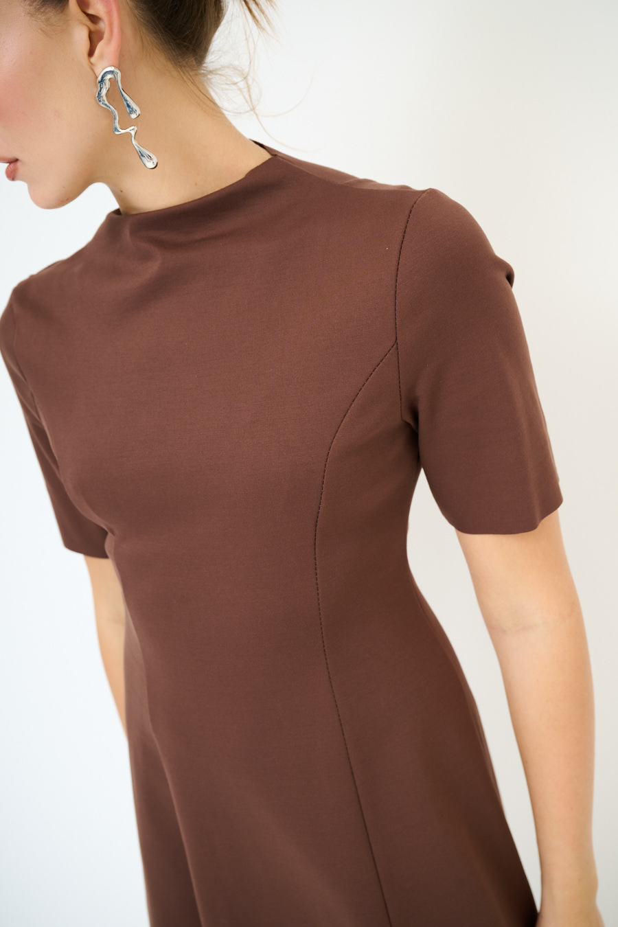 Abito midi sfiancato a mezza manica con colletto a cratere in tessuto elasticizzato.