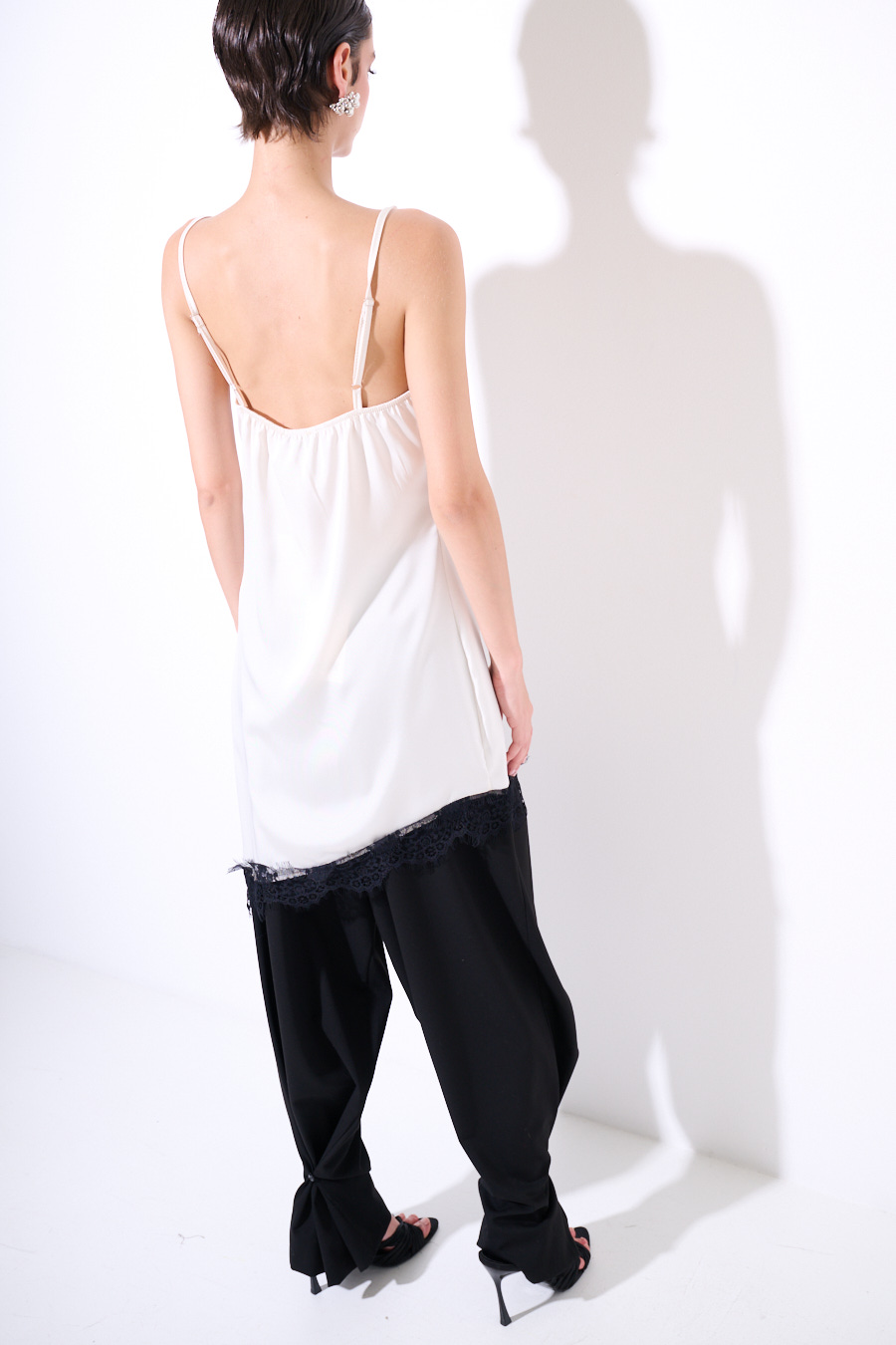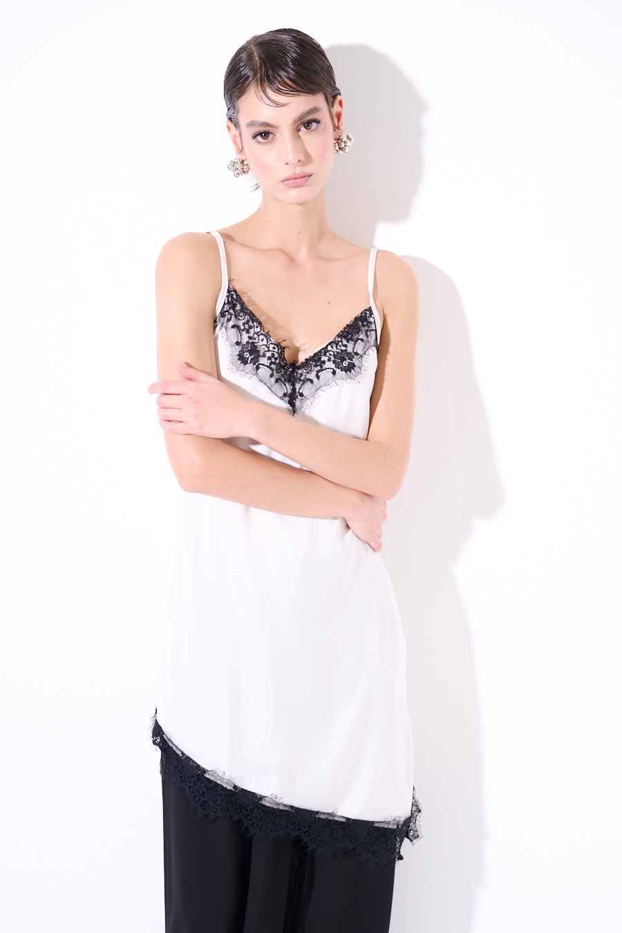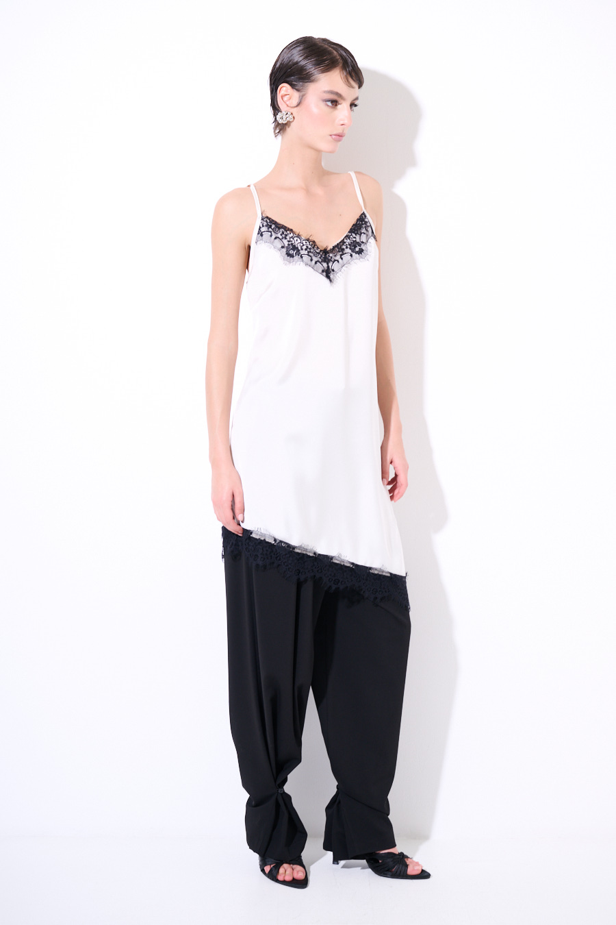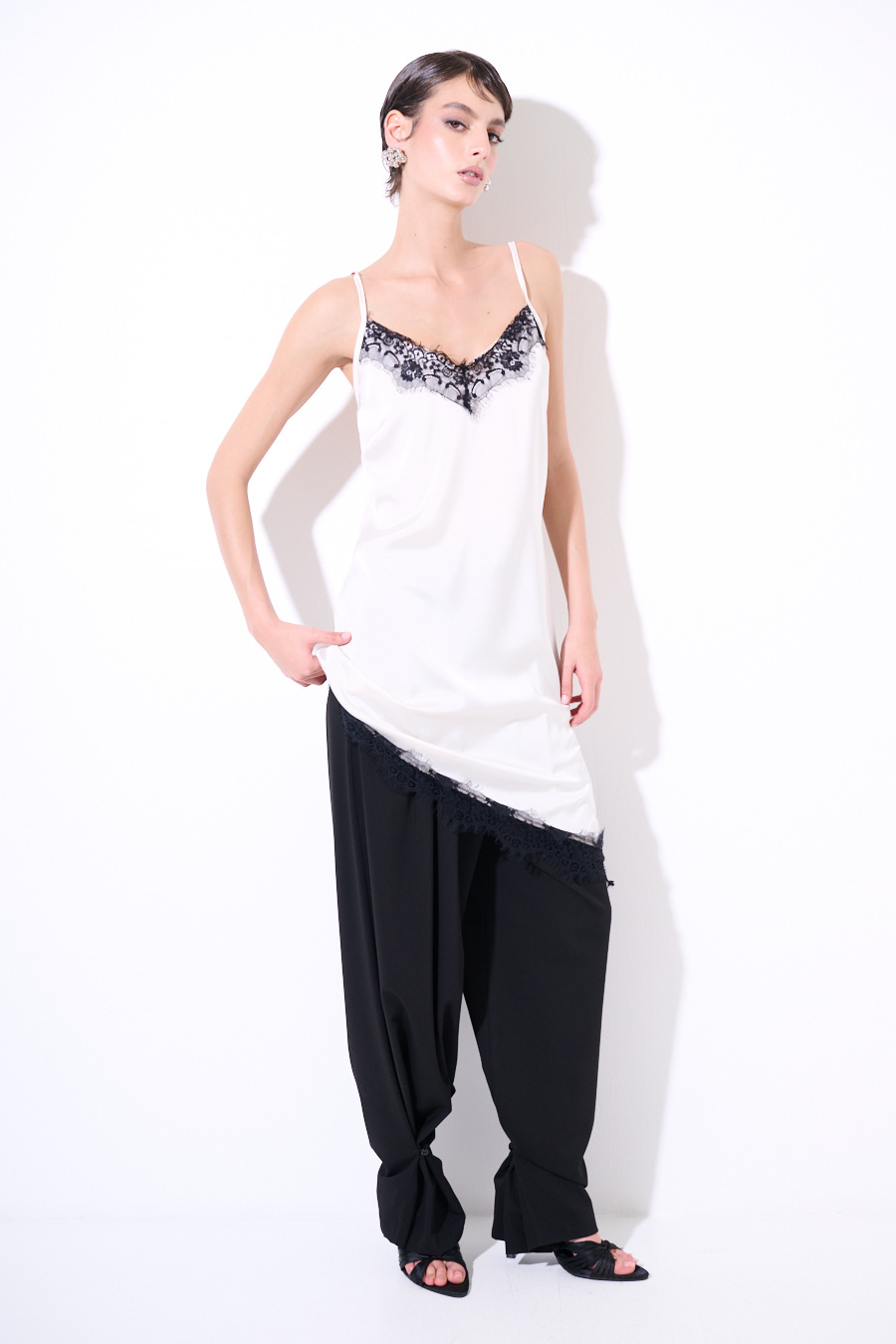 Abito midi asimmetrico sul fondo con pizzo nero a contrasto, con spallina sottile regolabile.