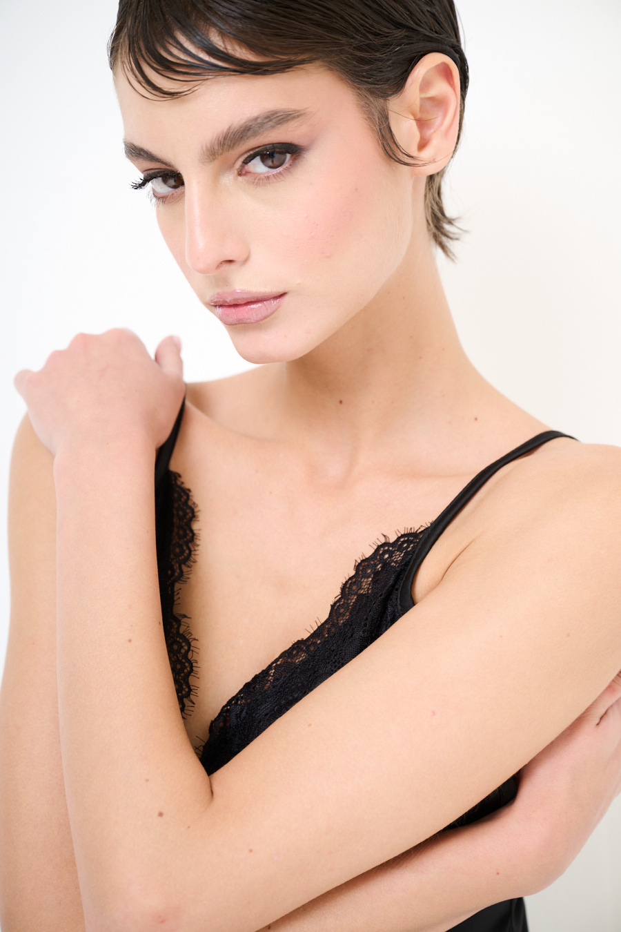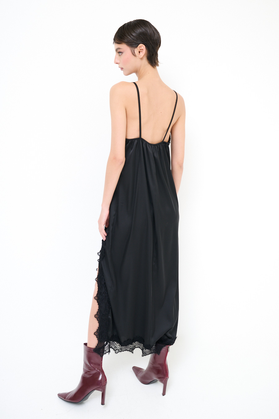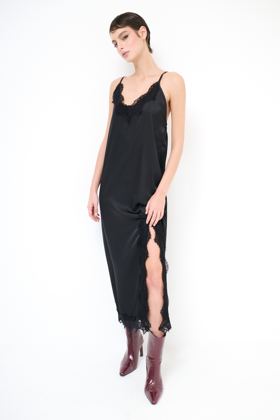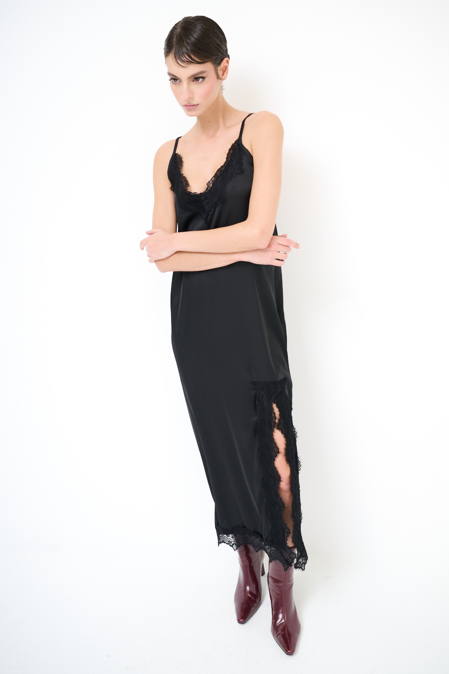 Abito lungo con pizzo nero a contrasto, con spallina sottile regolabile e spacco profondo laterale.