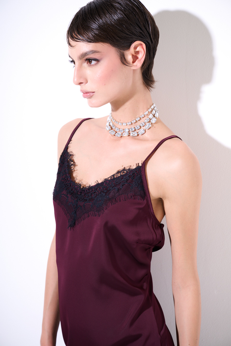 Abito midi asimmetrico sul fondo con pizzo nero a contrasto, con spallina sottile regolabile.