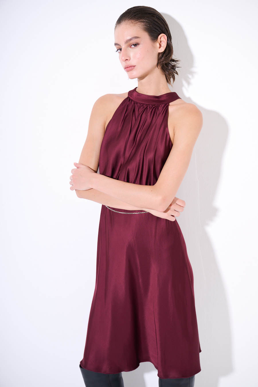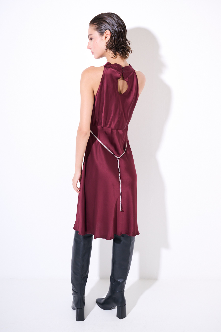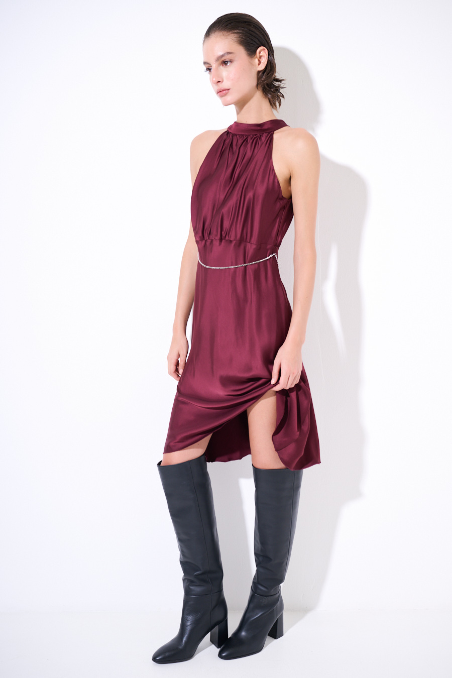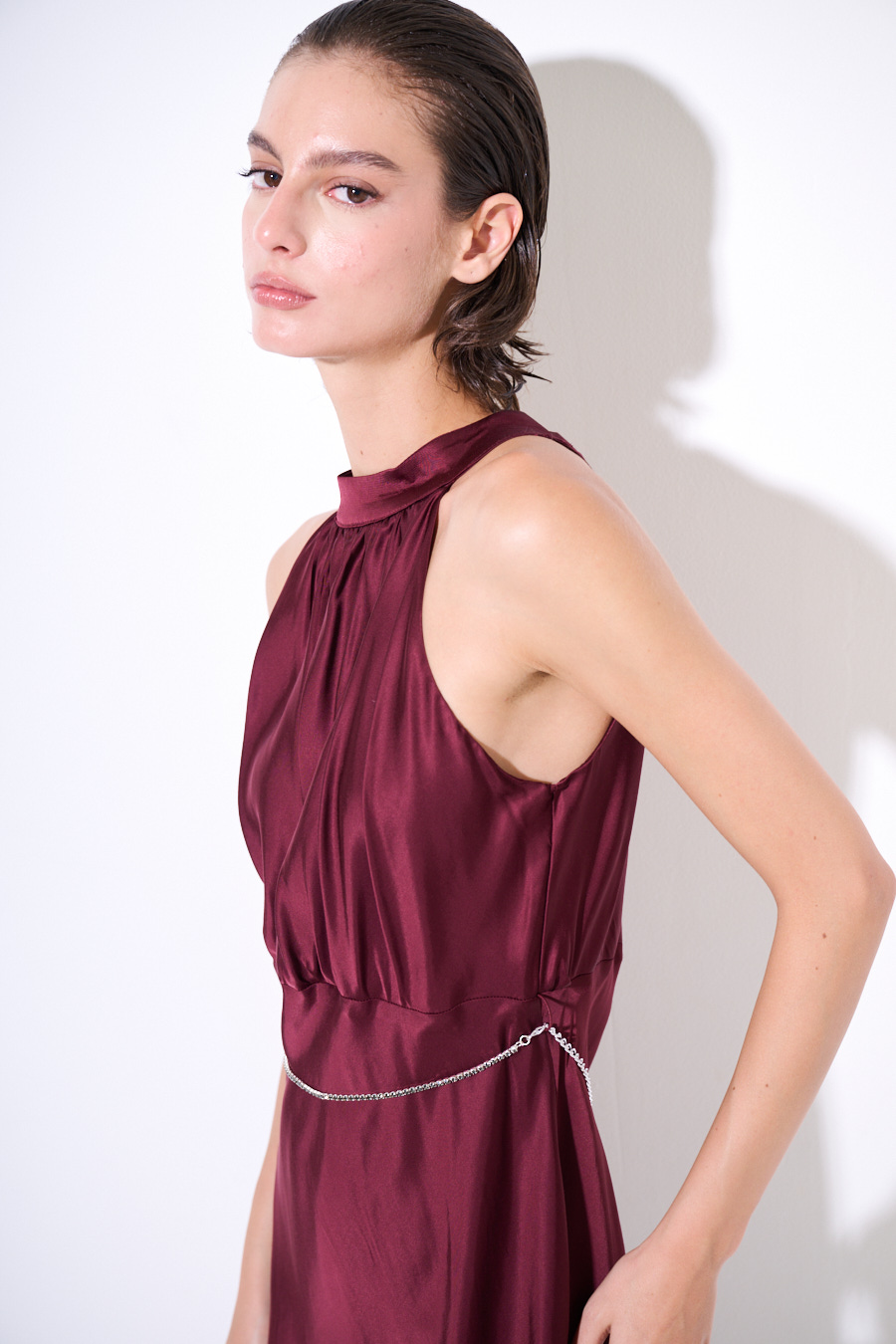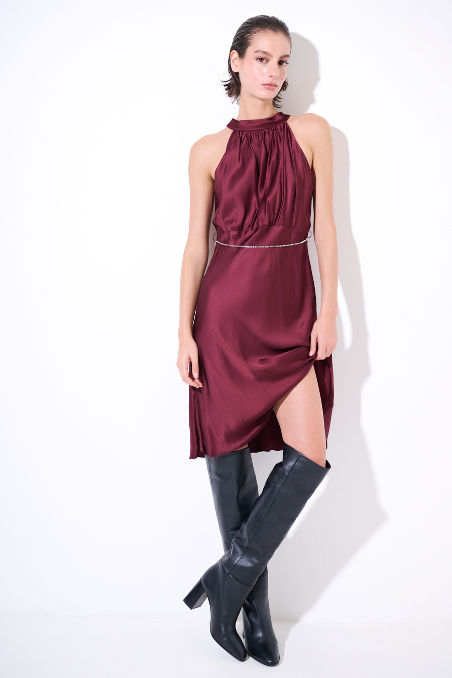 Abito midi in raso di viscosa con scollo americana, cintura gioiello in vita, con riprese al collo.