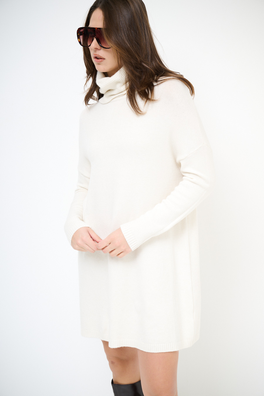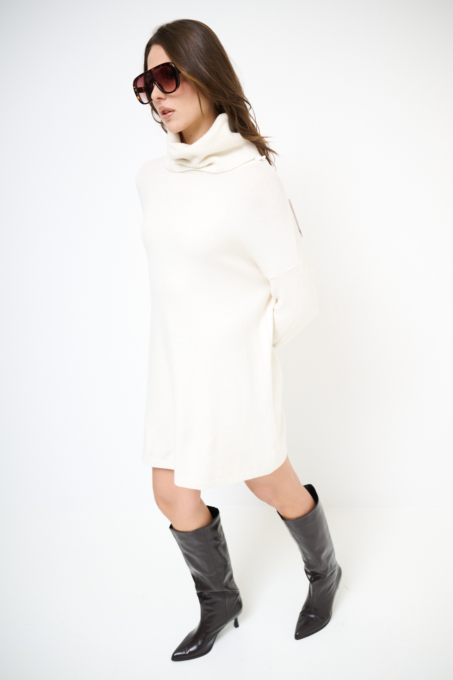 Maglia/abito con collo alto a chicco di riso e spalla calata.