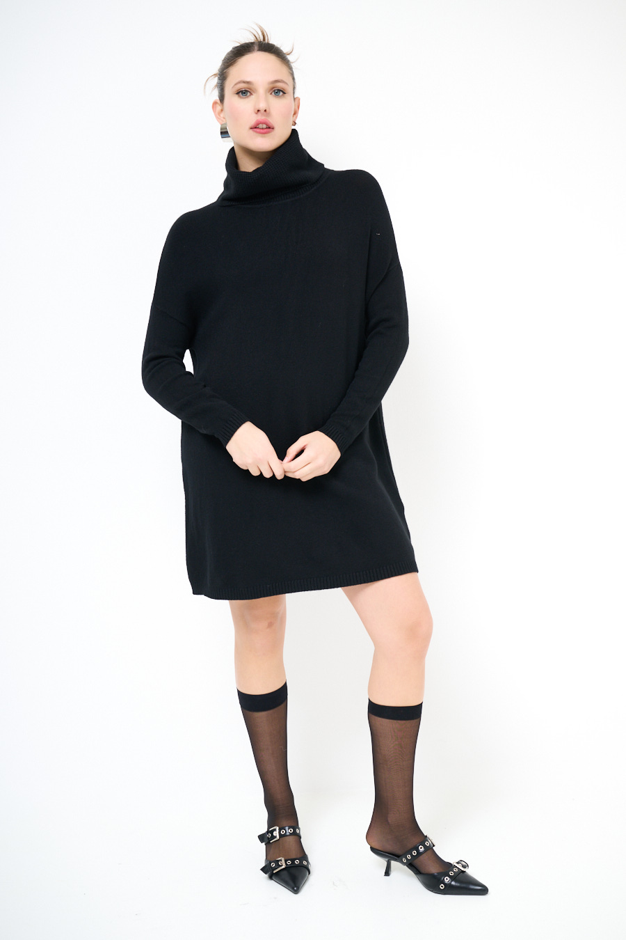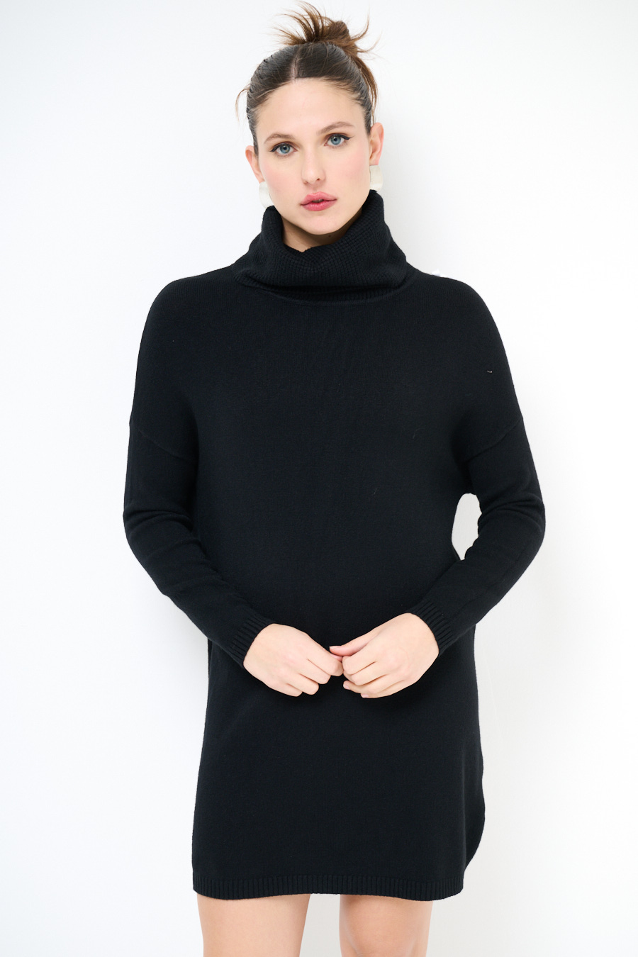 Maglia/abito con collo alto a chicco di riso e spalla calata.