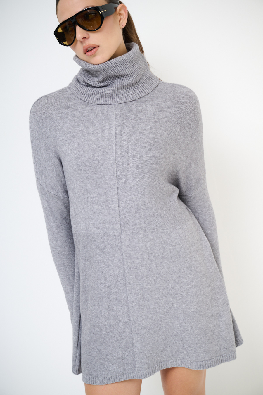 Maxi maglia con dolcevita a chicco di riso, cuciture centrali e con spalle calata.