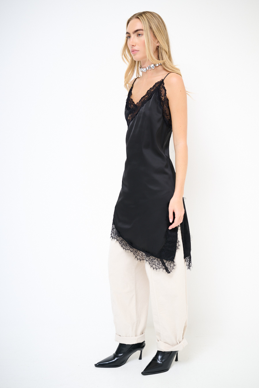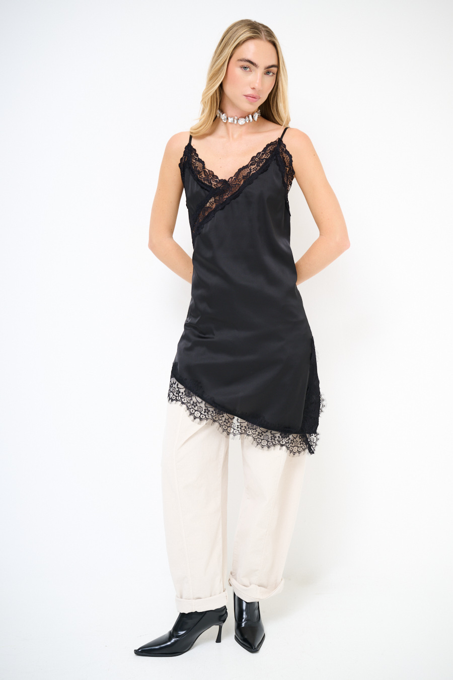Abito mini asimmetrico sottoveste in raso con pizzo a contrasto, con spalline sottili regolabili.