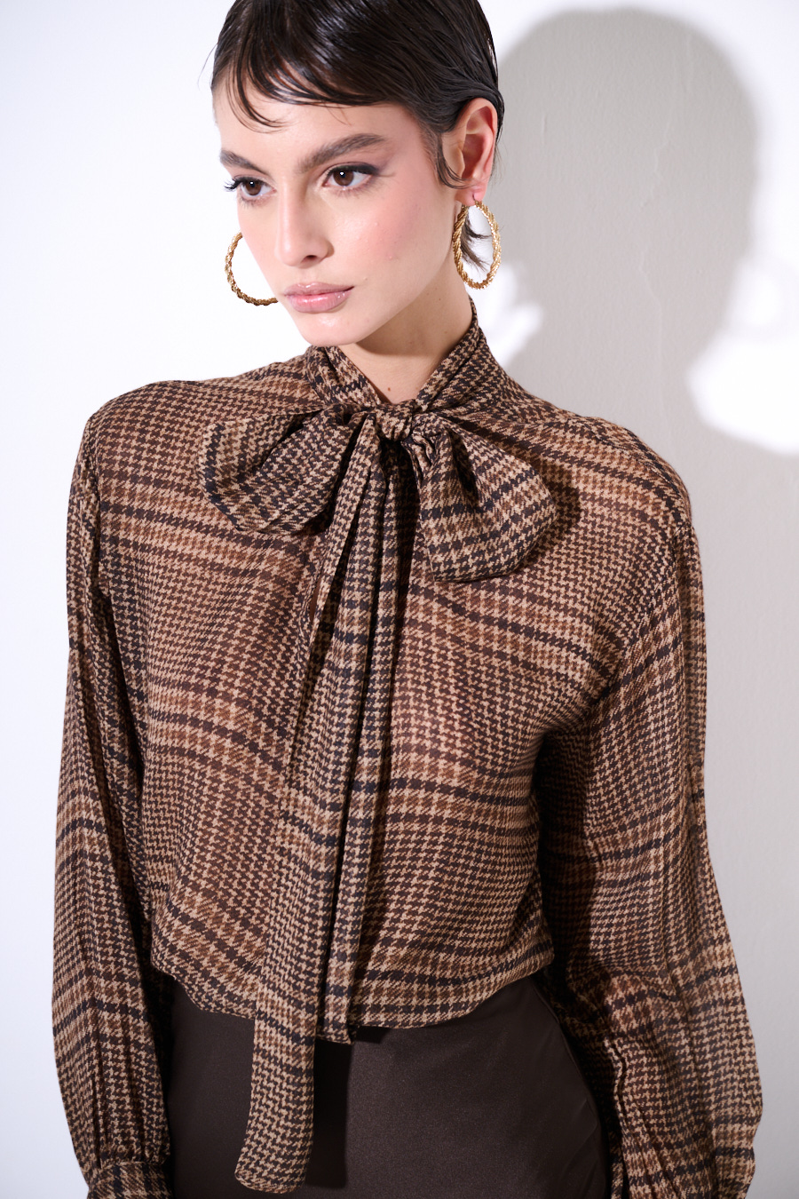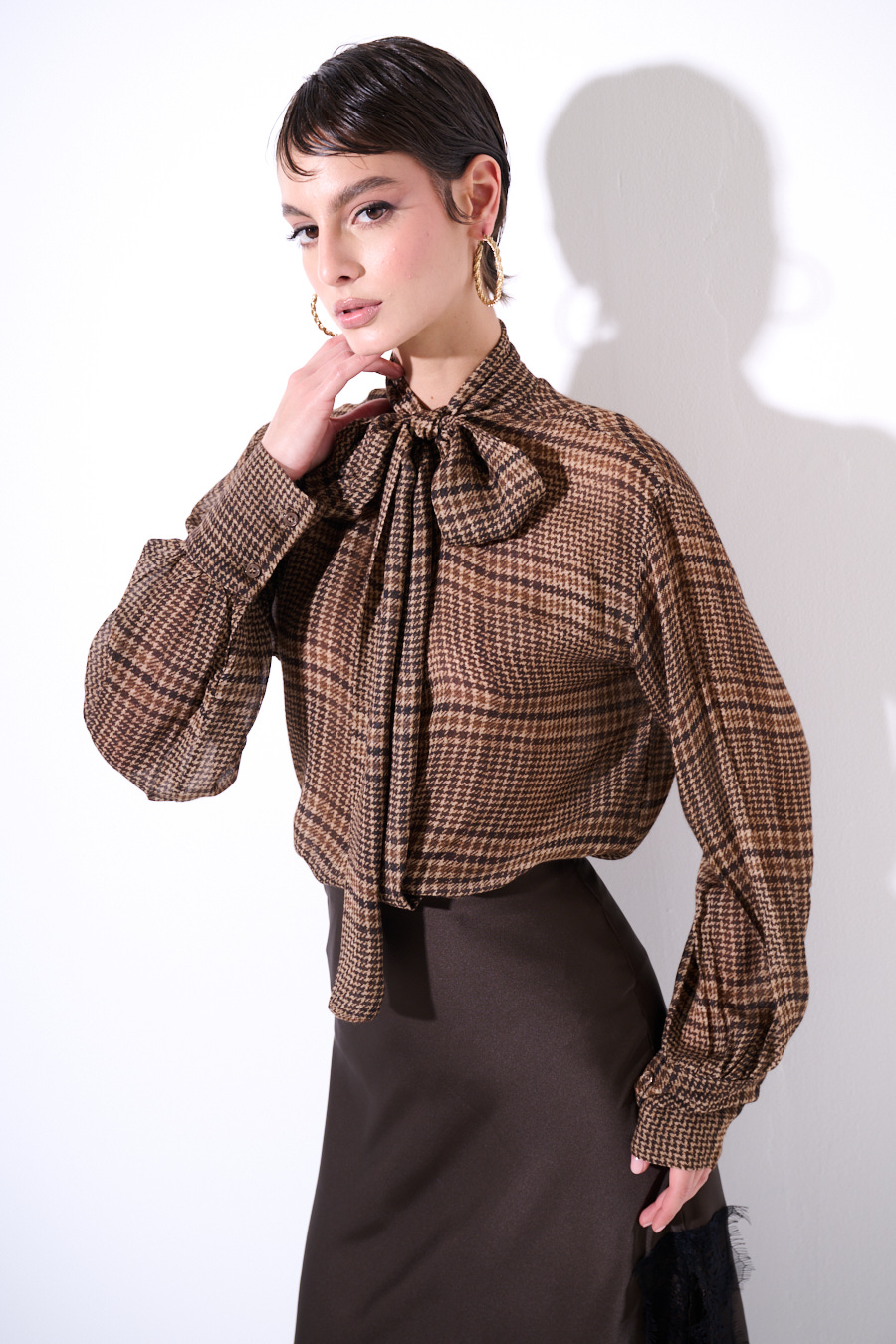 Camicia ampia a quadri con fiocco al collo, spalla calata e polsino alto, misto lana/viscosa.