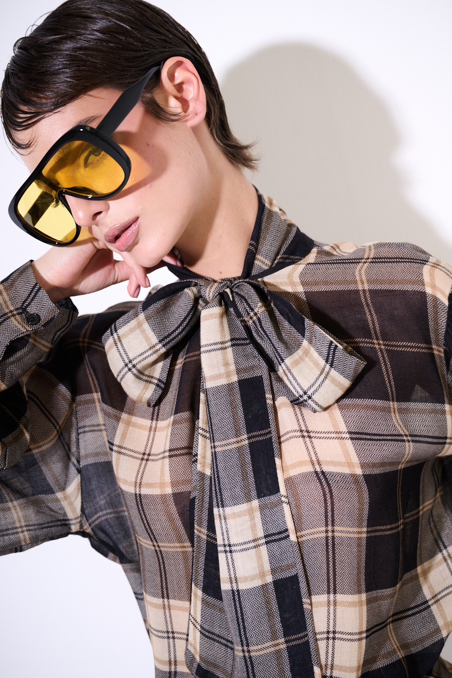 Camicia ampia a quadri con fiocco al collo, spalla calata e polsino alto, misto lana/viscosa.