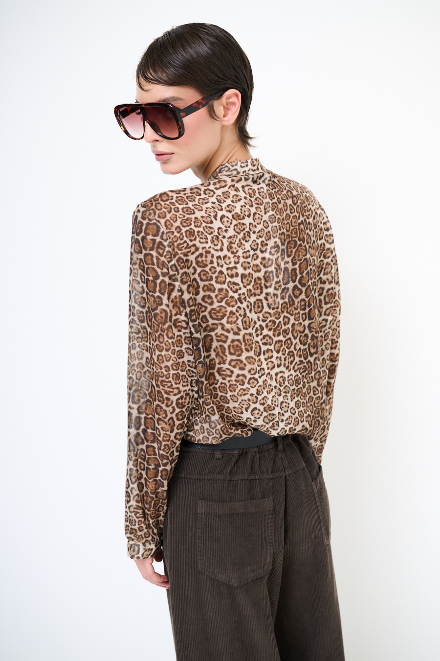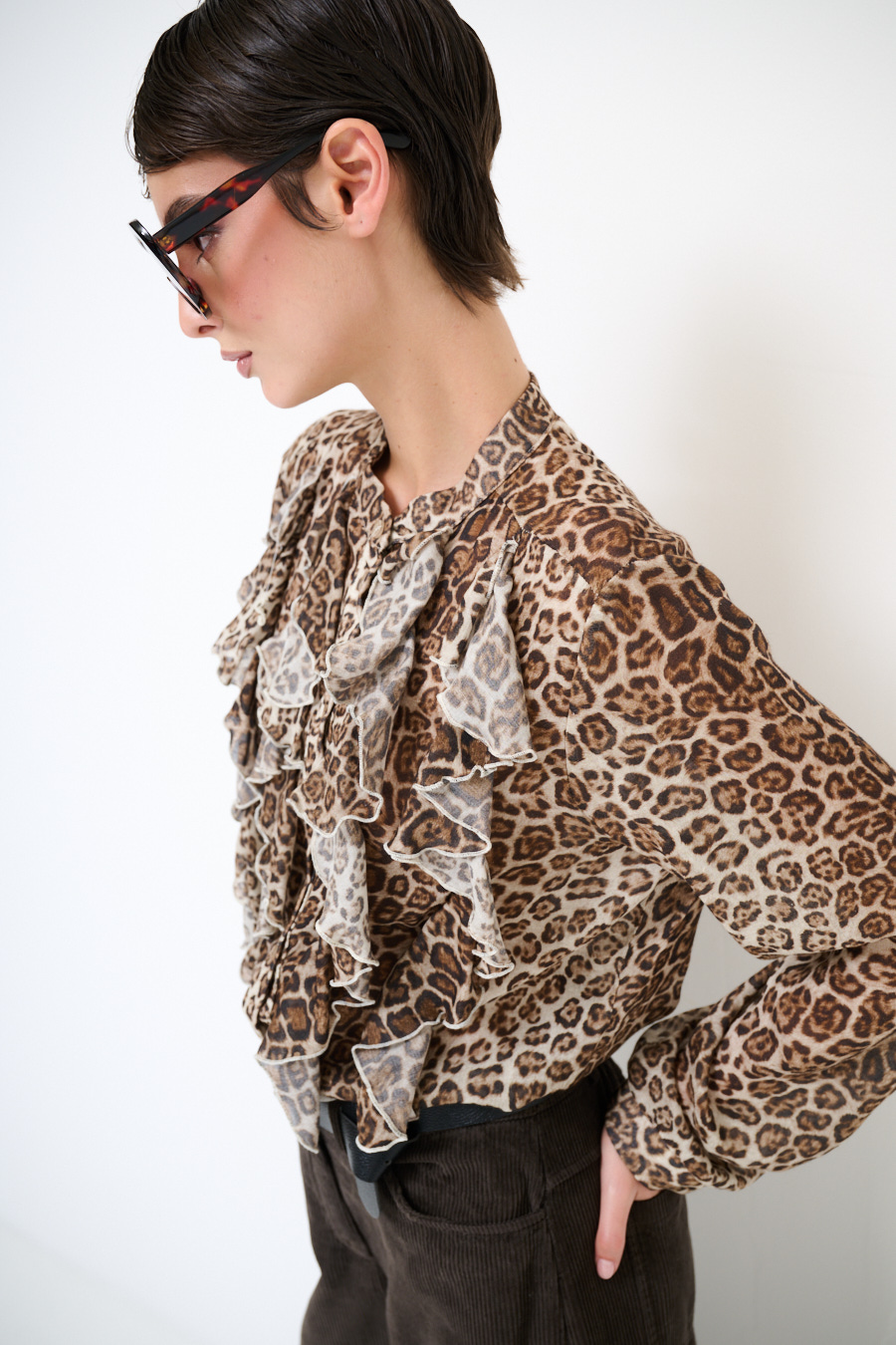 Camicia maculata in garza di viscosa e lana, con ampie rouches sul davanti e collo a corena.