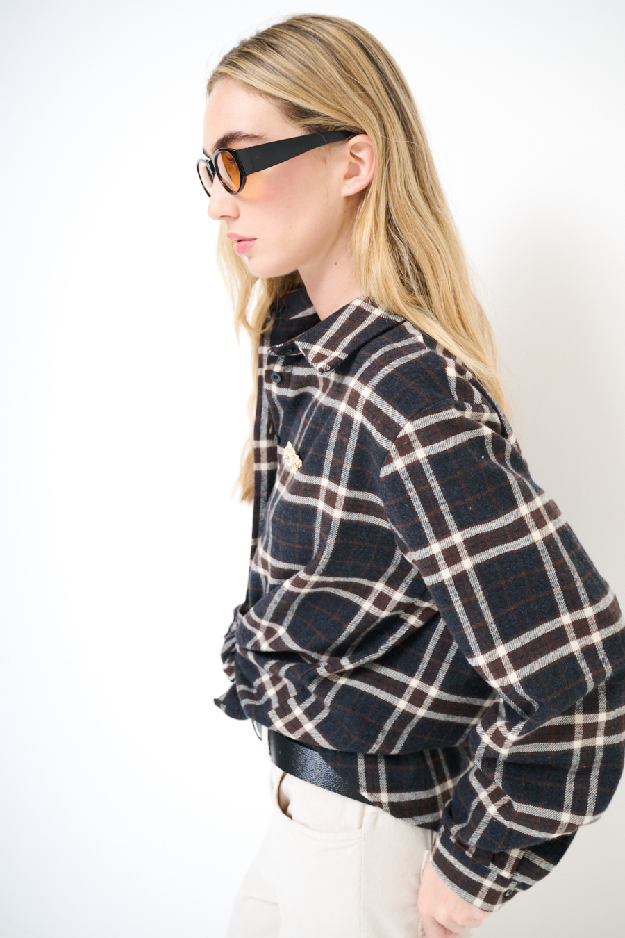 Camicia over check in flanella con abbottonatura centrale e spilla sul lato.