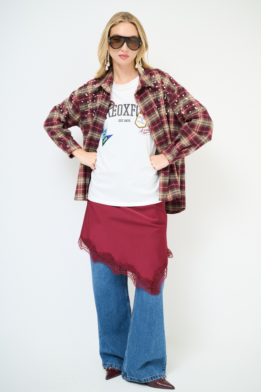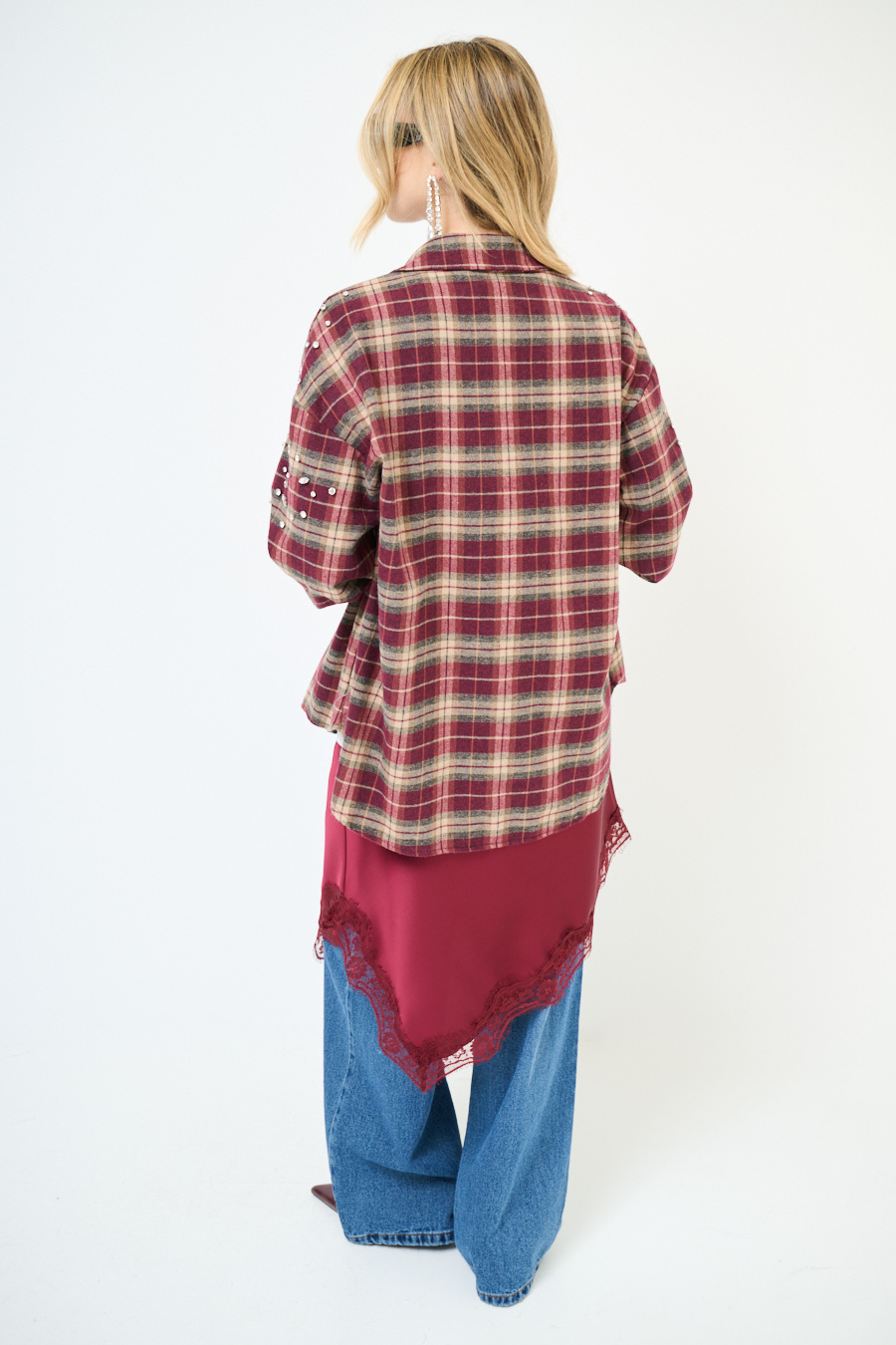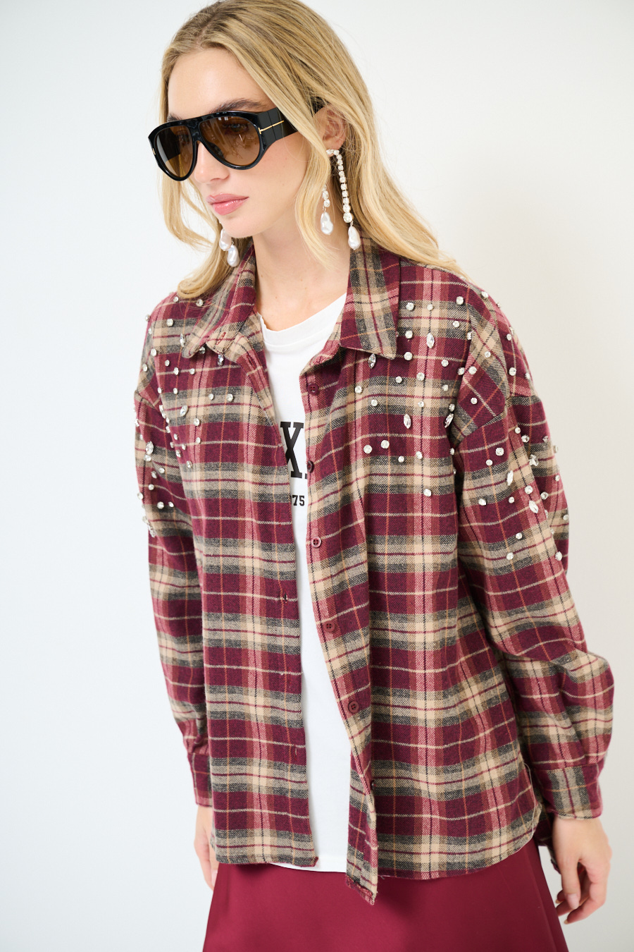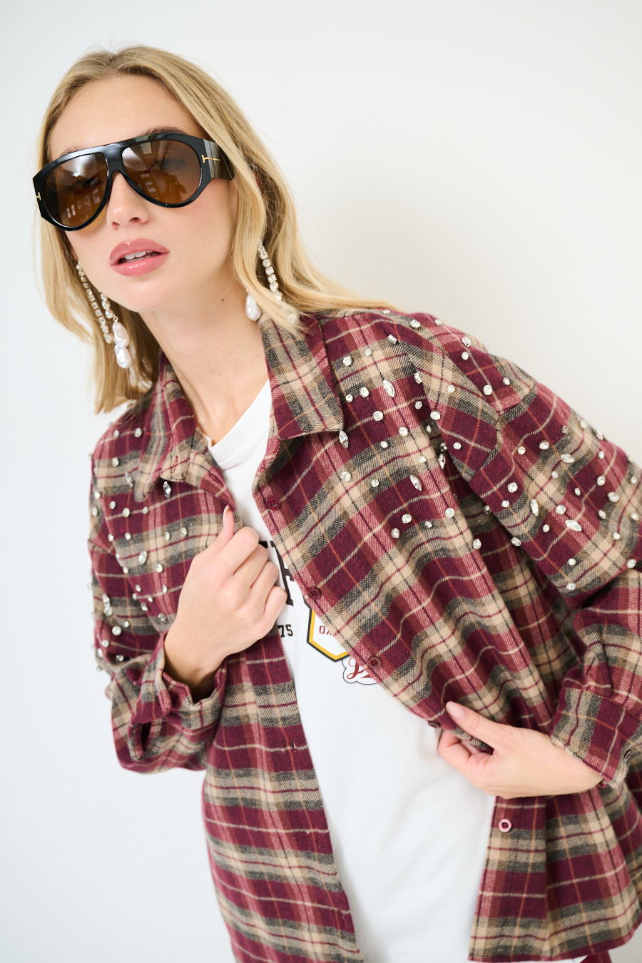 CAMICIA OVER QUADRO CON CASTONI BORDEAUX