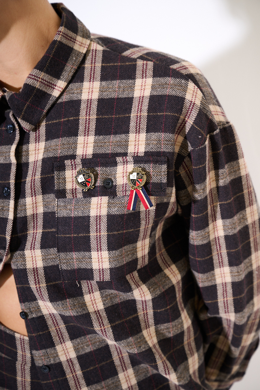 Camicia a quadri a taglio vivo sul fondo, con taschini con applicazione spille.
