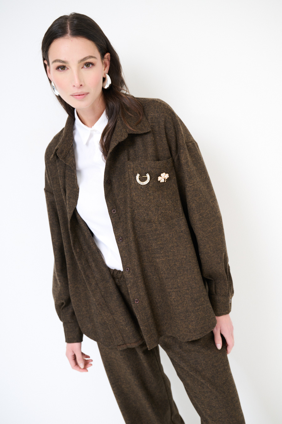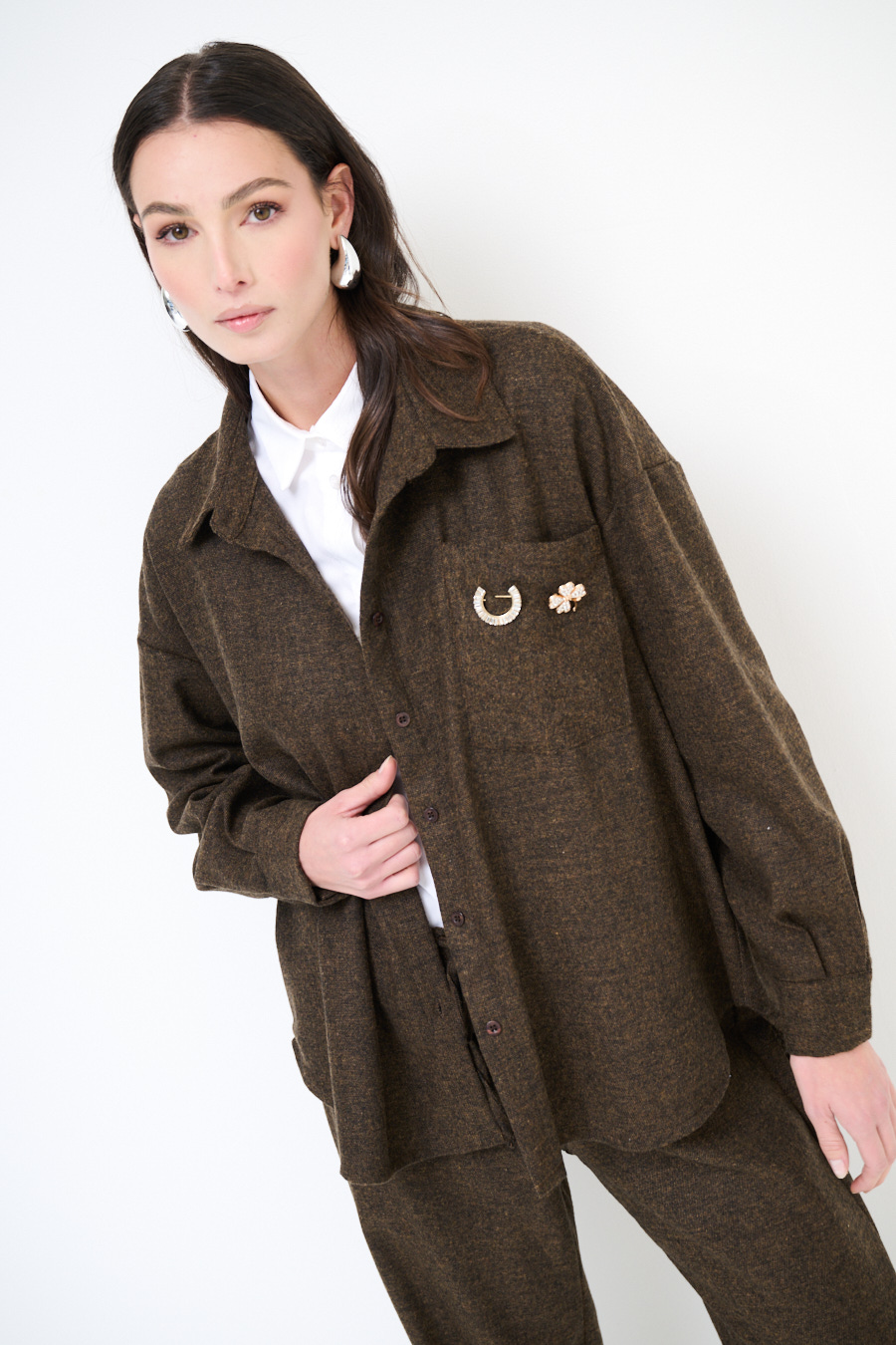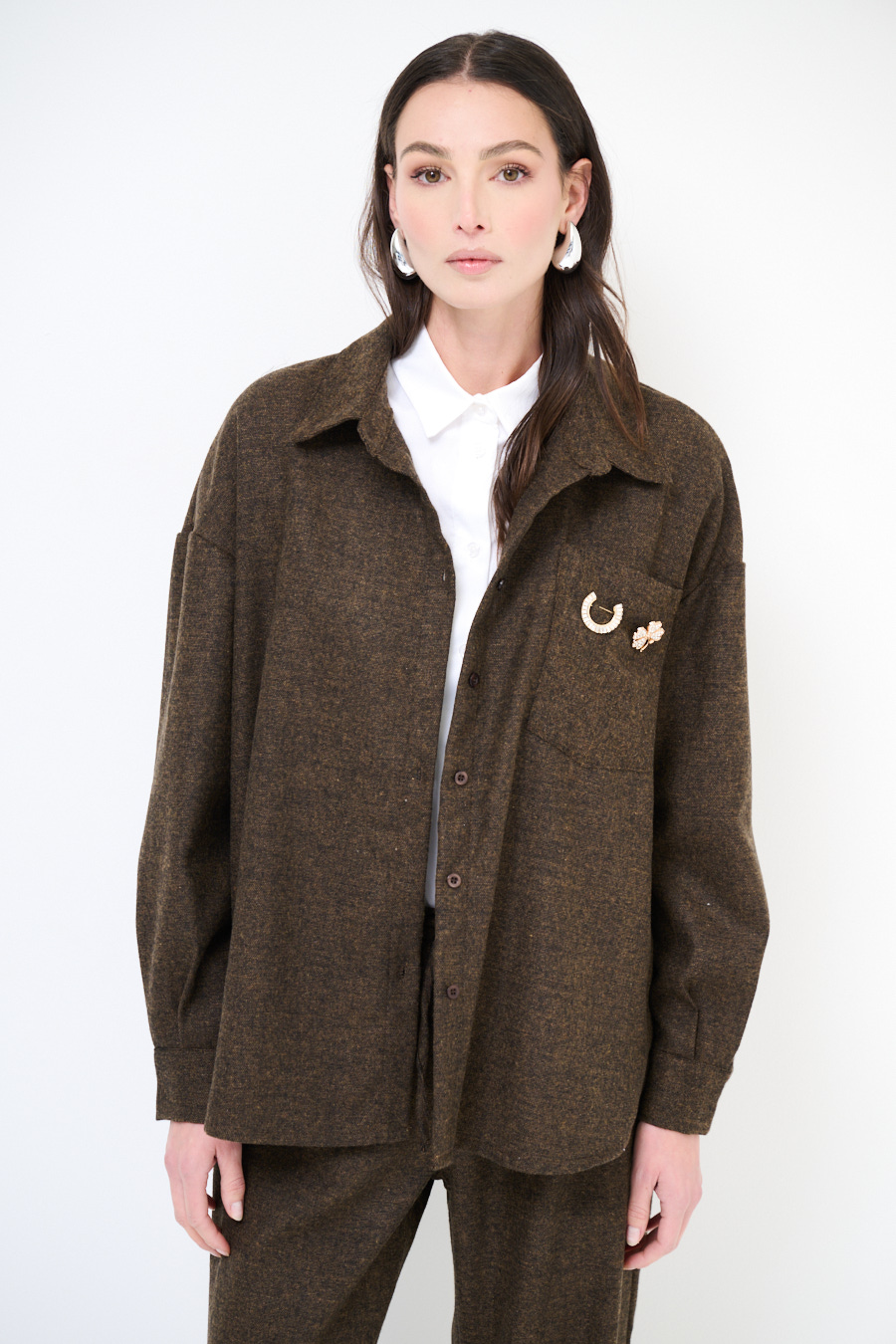 Camicia oversize in flanella con abbottonatura frontale, più lunga sul retro e spille applicate sul taschino.