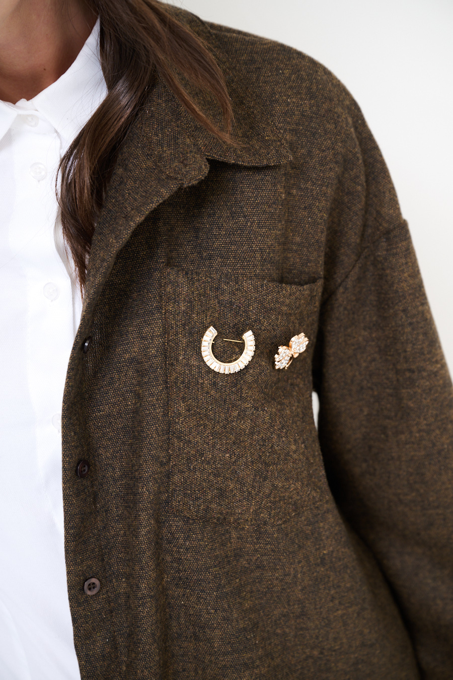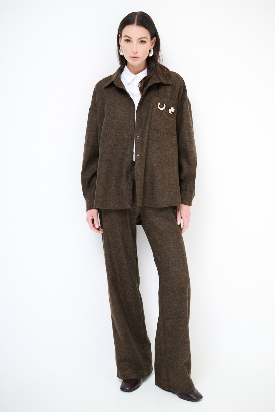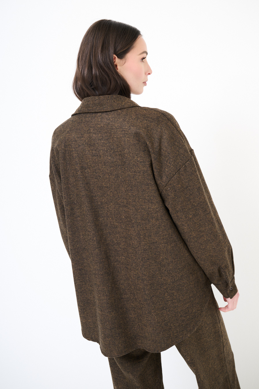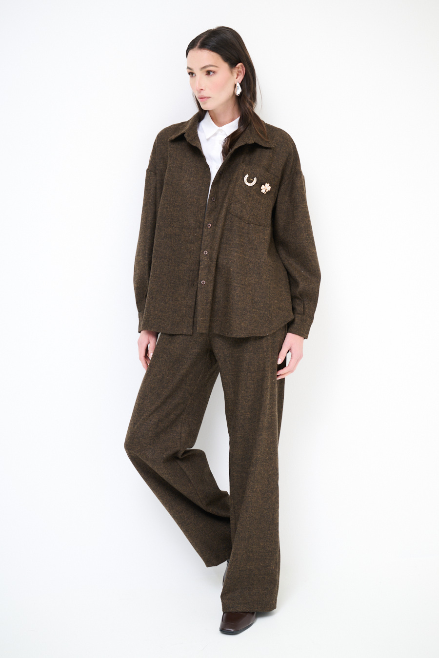 Camicia oversize in flanella con abbottonatura frontale, più lunga sul retro e spille applicate sul taschino.