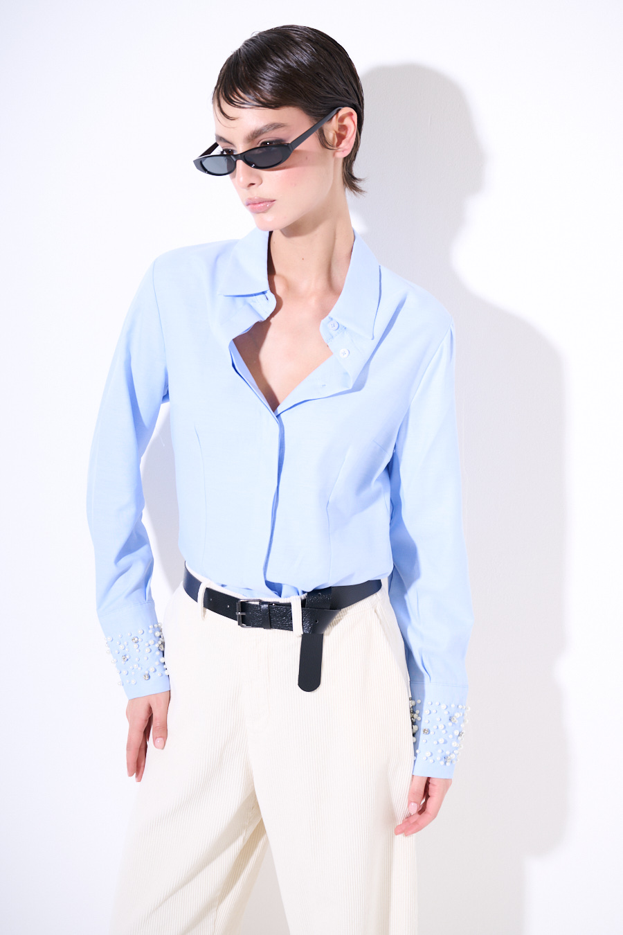 CAMICIA OXFORD CON POLSO STRASS E PERLE AZZURRA