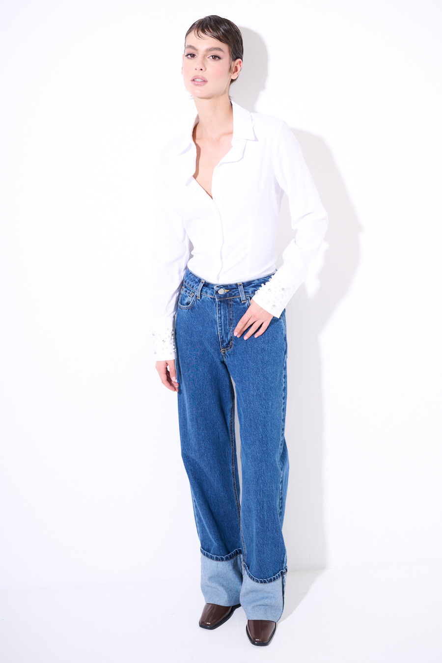 CAMICIA OXFORD CON POLSO STRASS E PERLE BIANCO