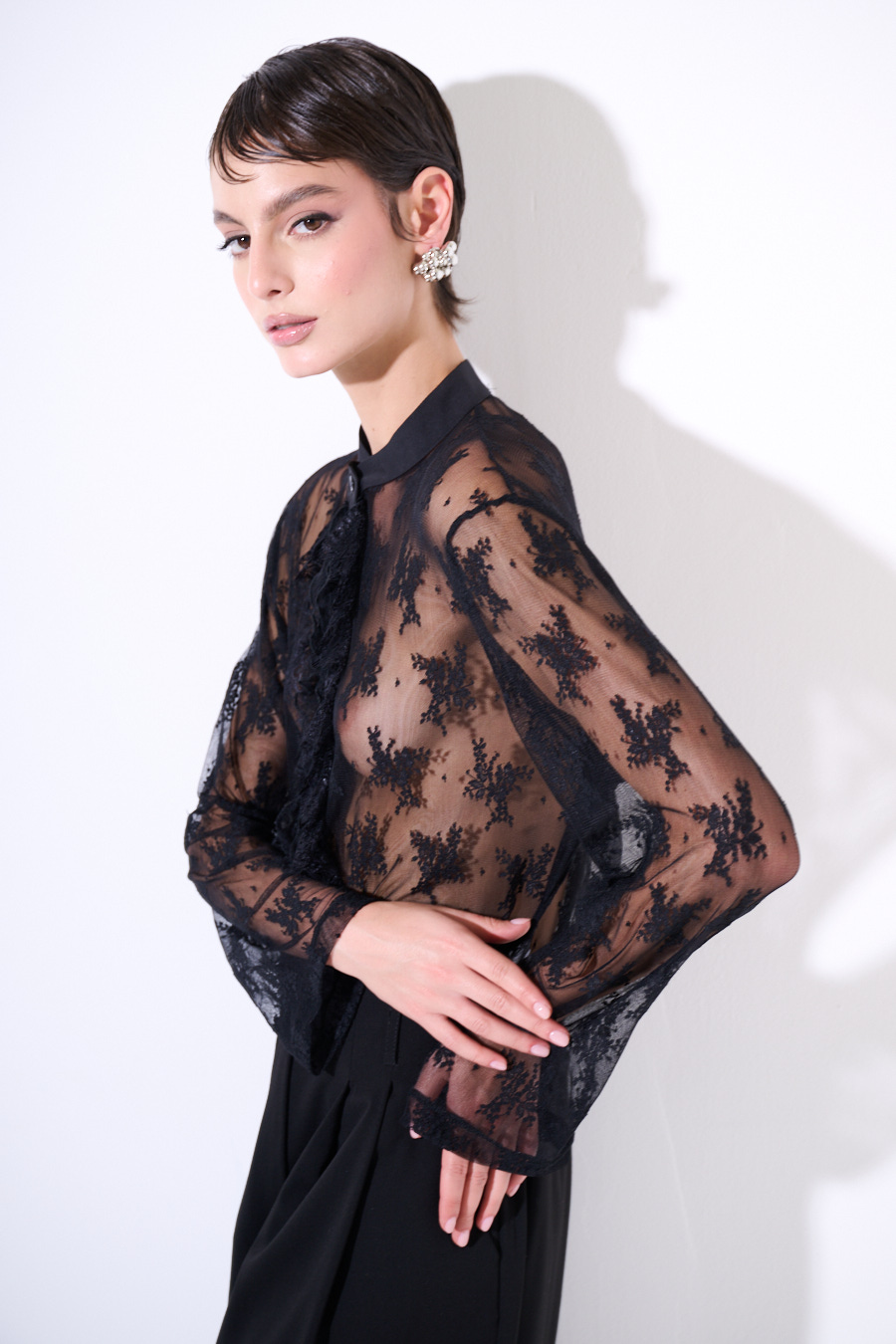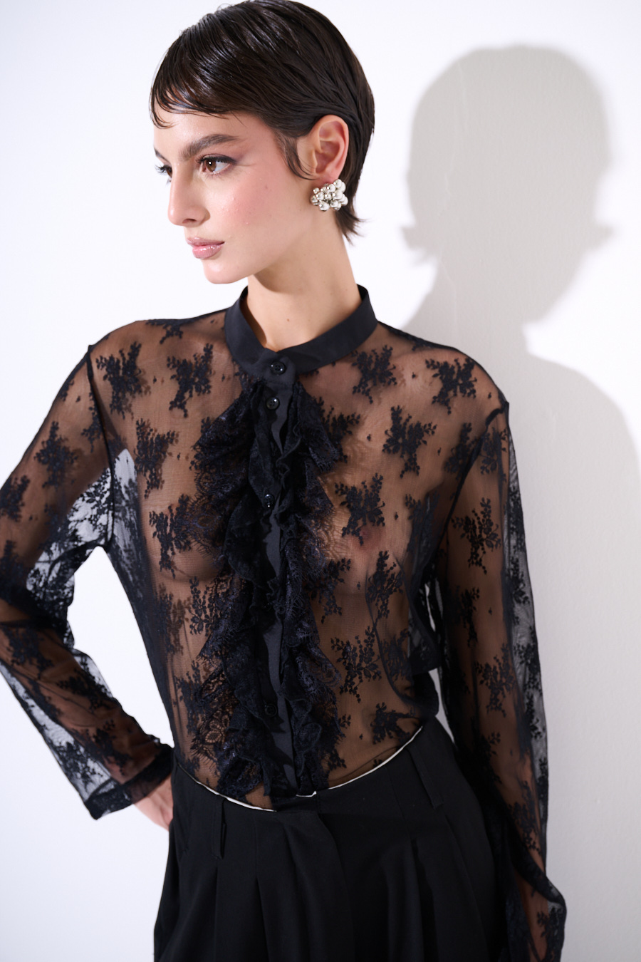 CAMICIA PIZZO CON ROUCHES NERO