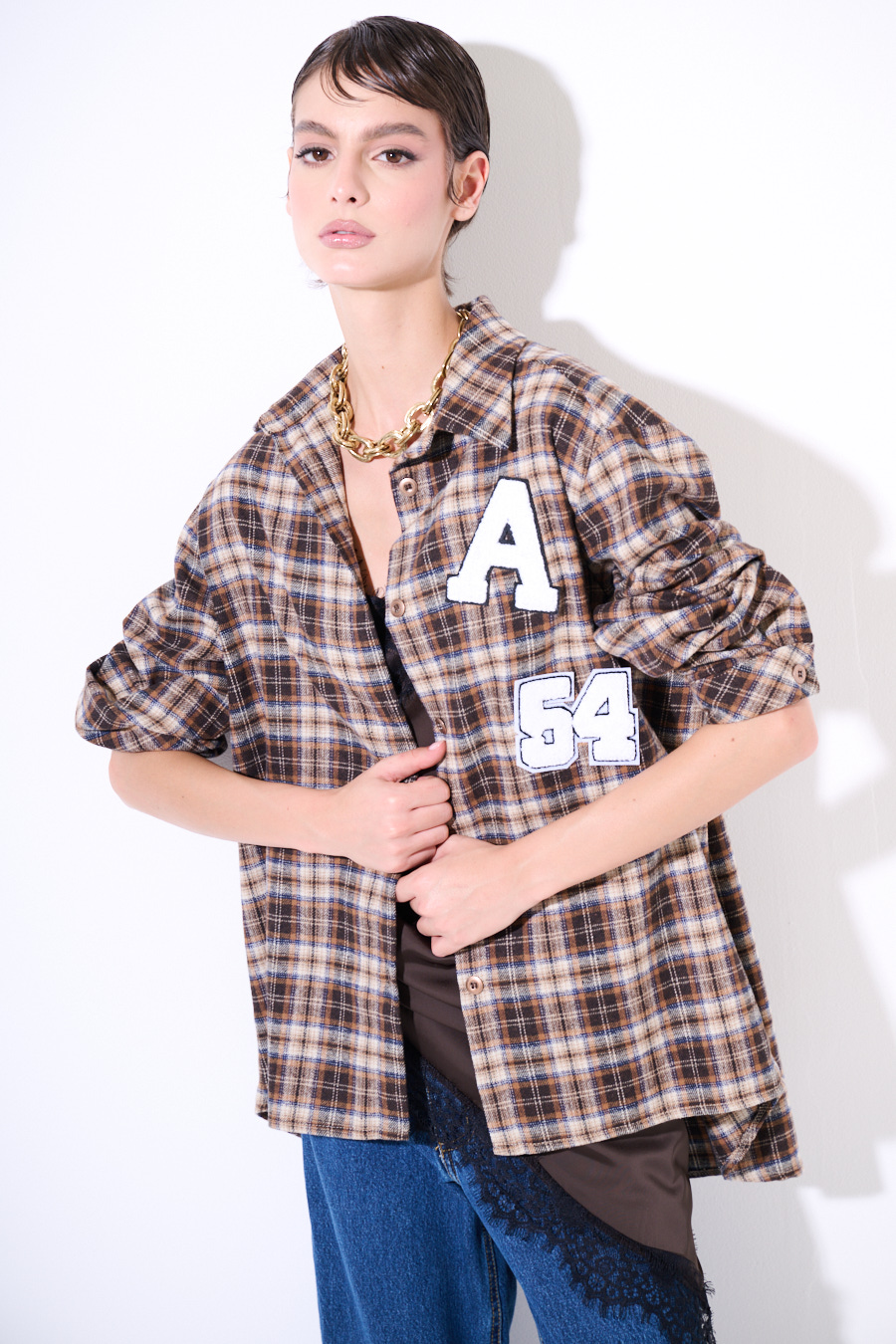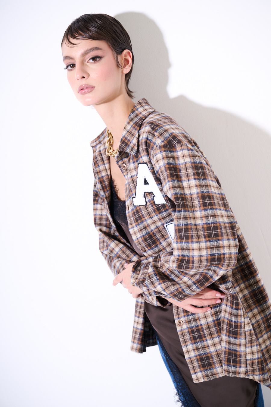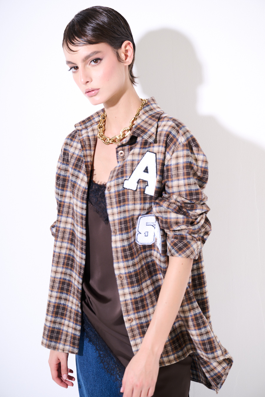 Camicia a quadri oversize, più lunga sul retro, con patch padded sul davanti.
