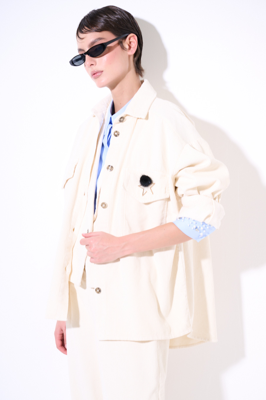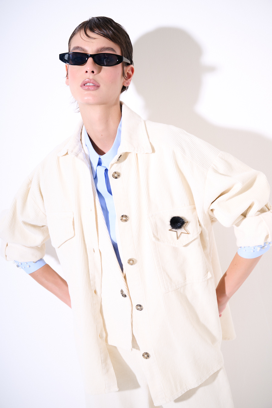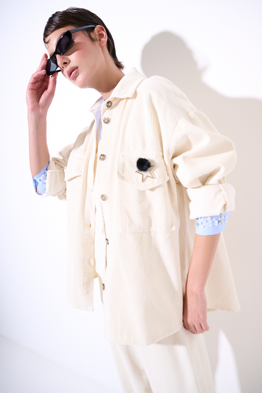 Camicia ampia in velluto a coste con ampi taschini frontali e spilla applicata, stondata sul fondo.