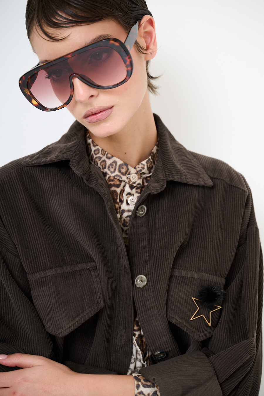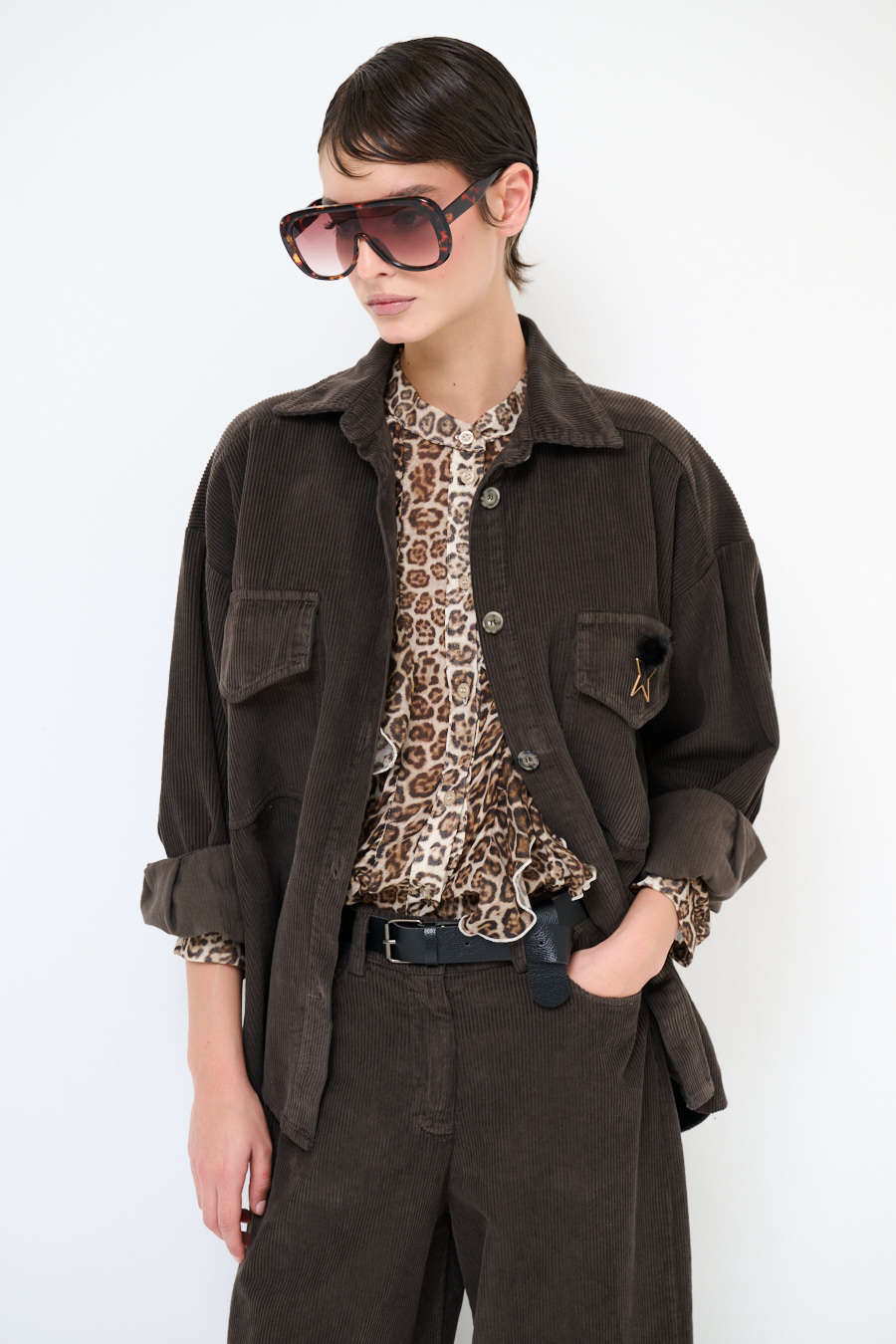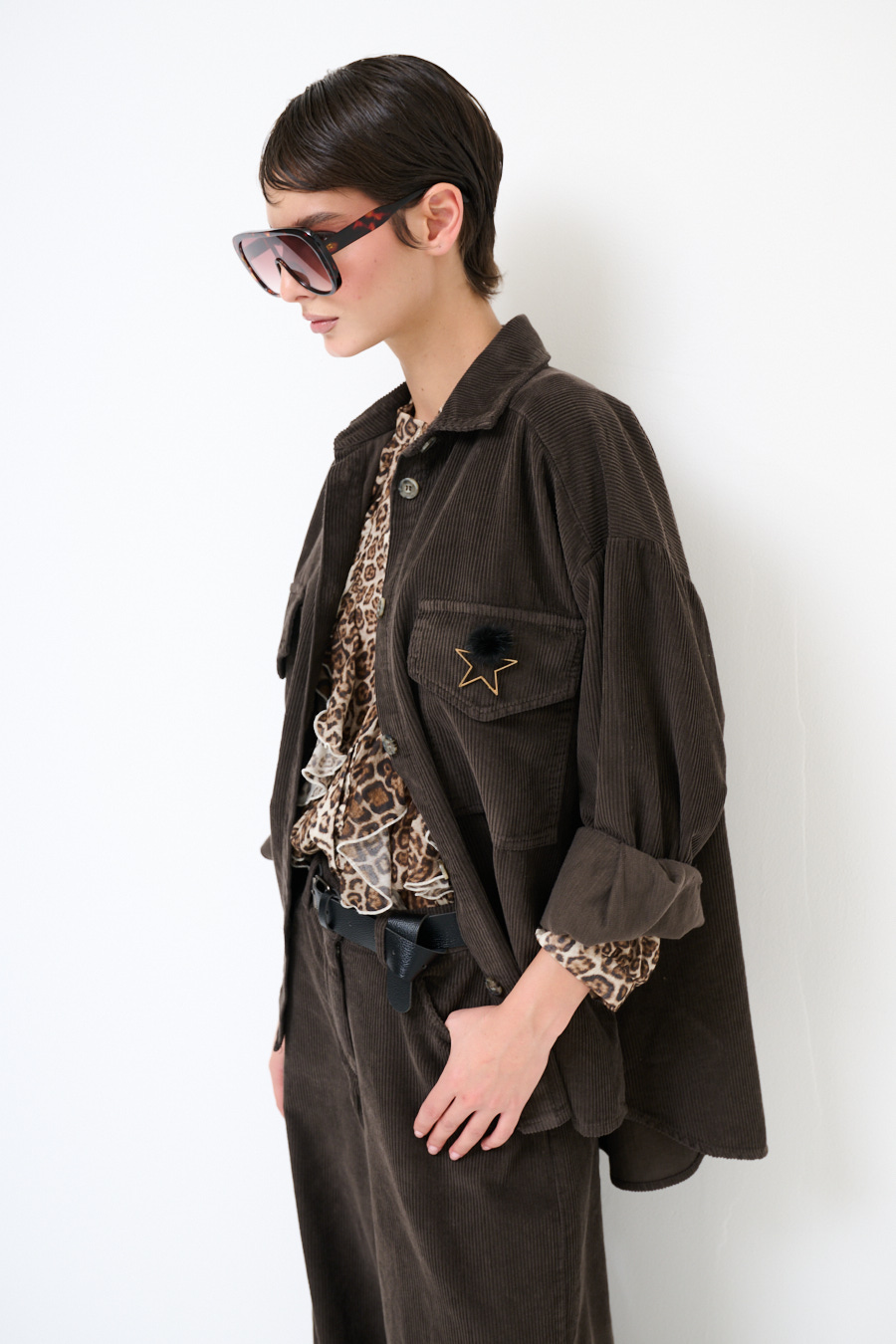 Camicia ampia in velluto a coste con ampi taschini frontali e spilla applicata, stondata sul fondo.