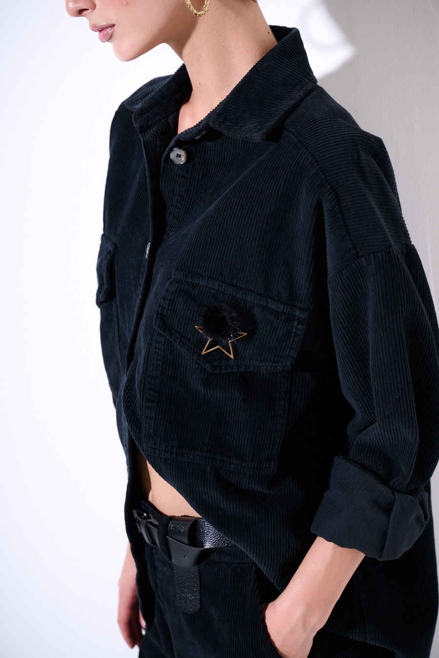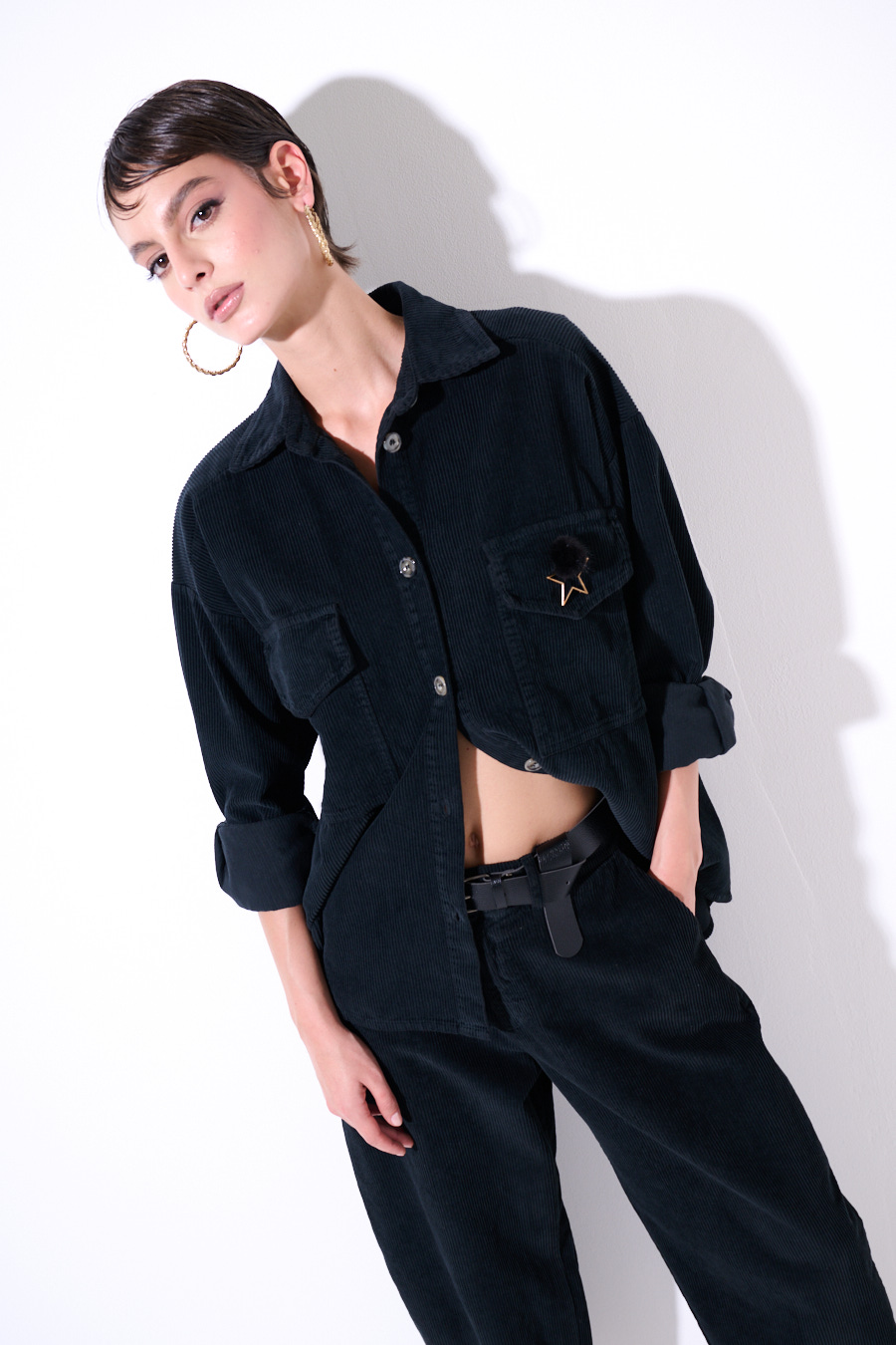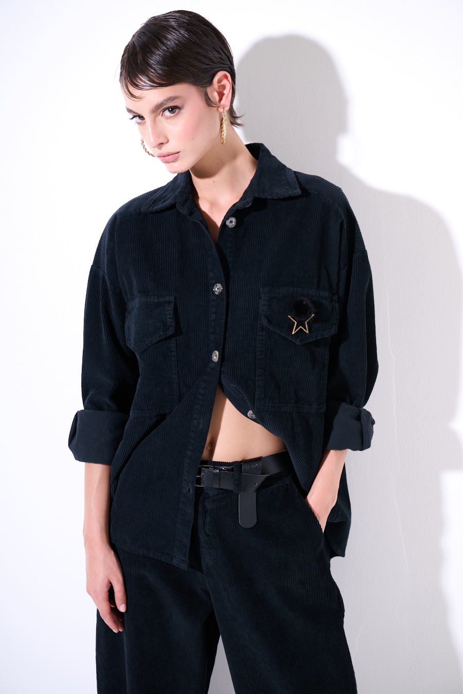 Camicia ampia in velluto a coste con ampi taschini frontali e spilla applicata, stondata sul fondo.
