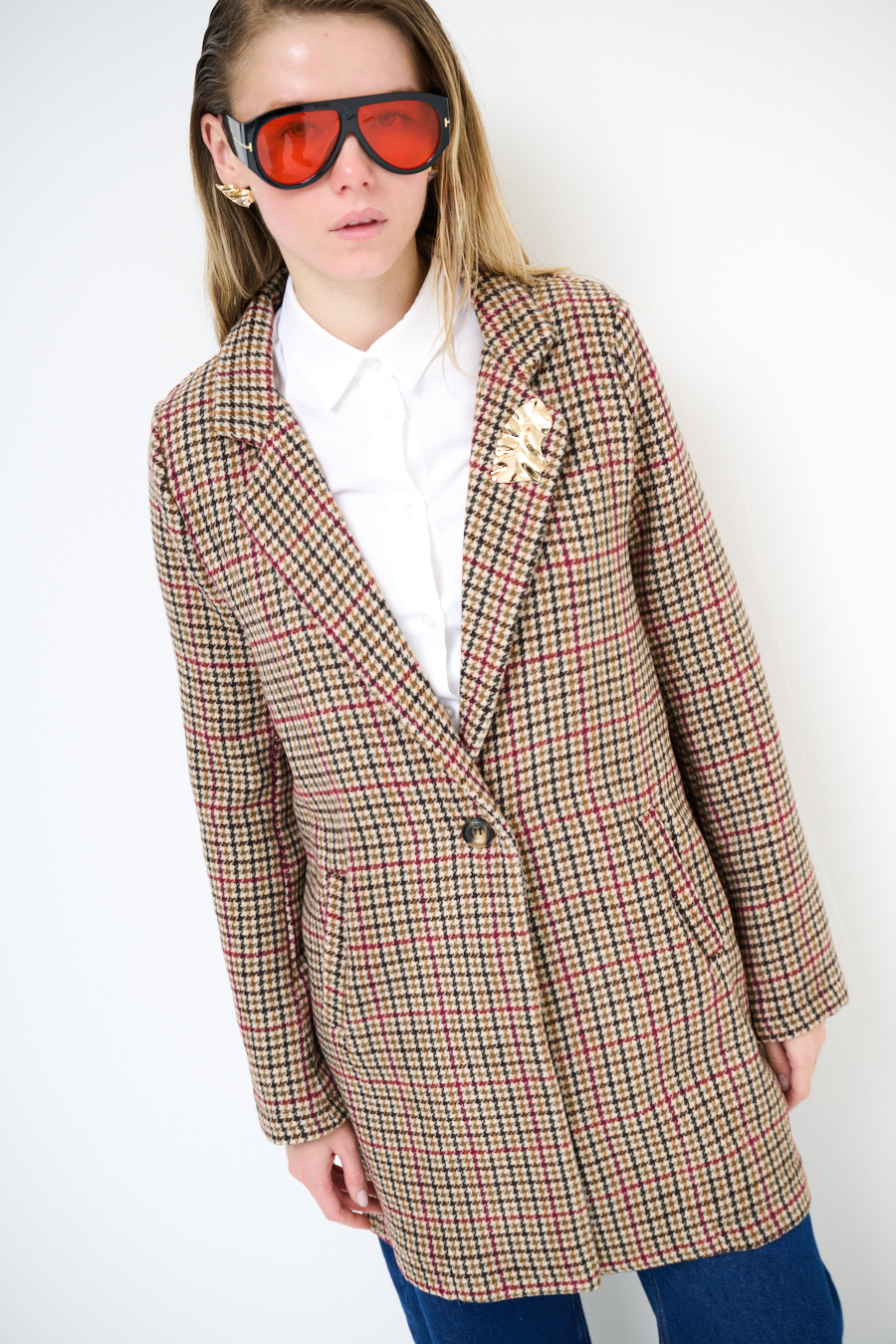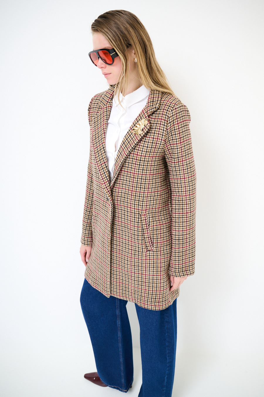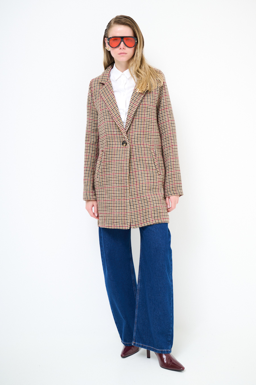 Cappottino midi con disegno micro pied de poule a un bottone, con taschini frontali e collo rever.