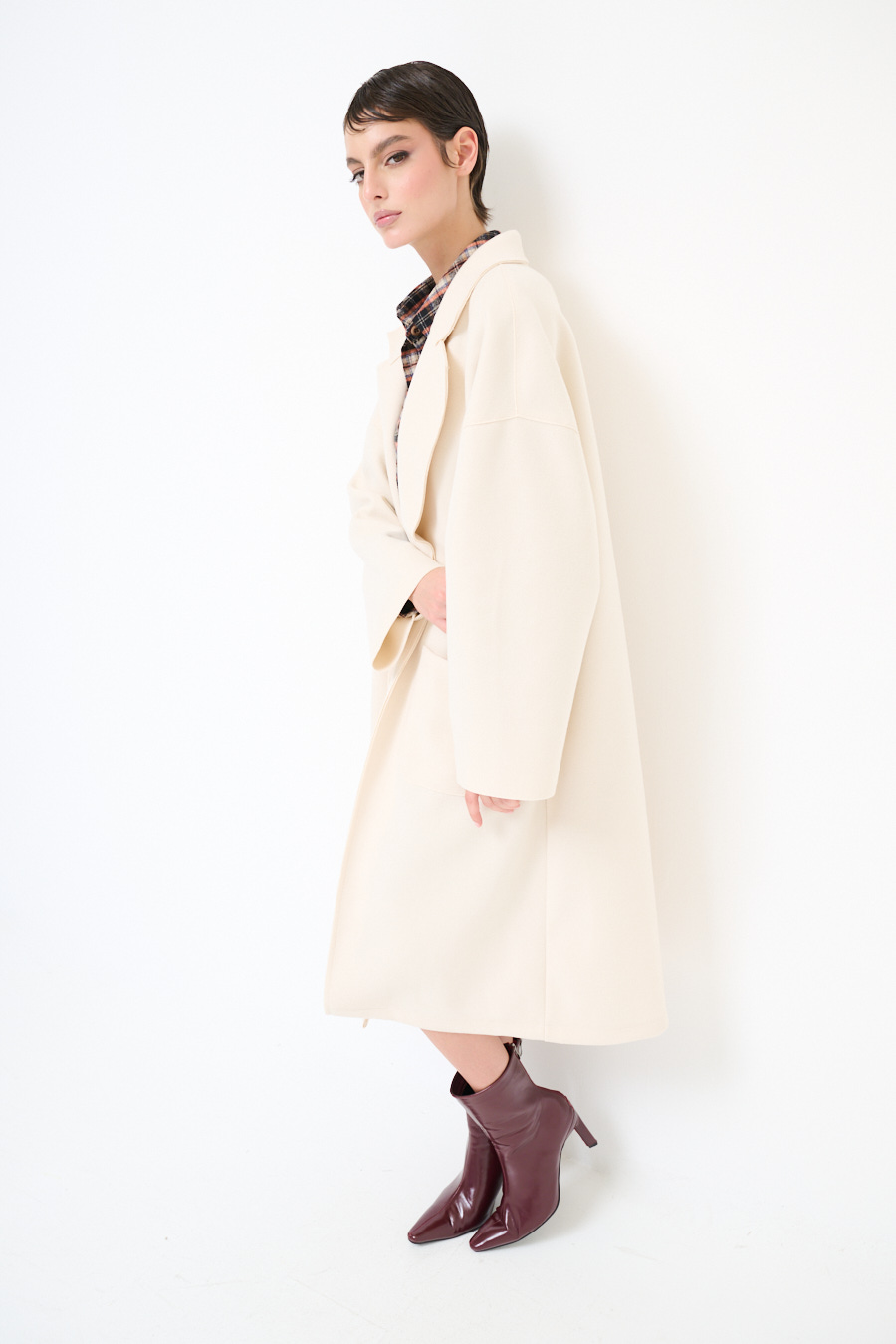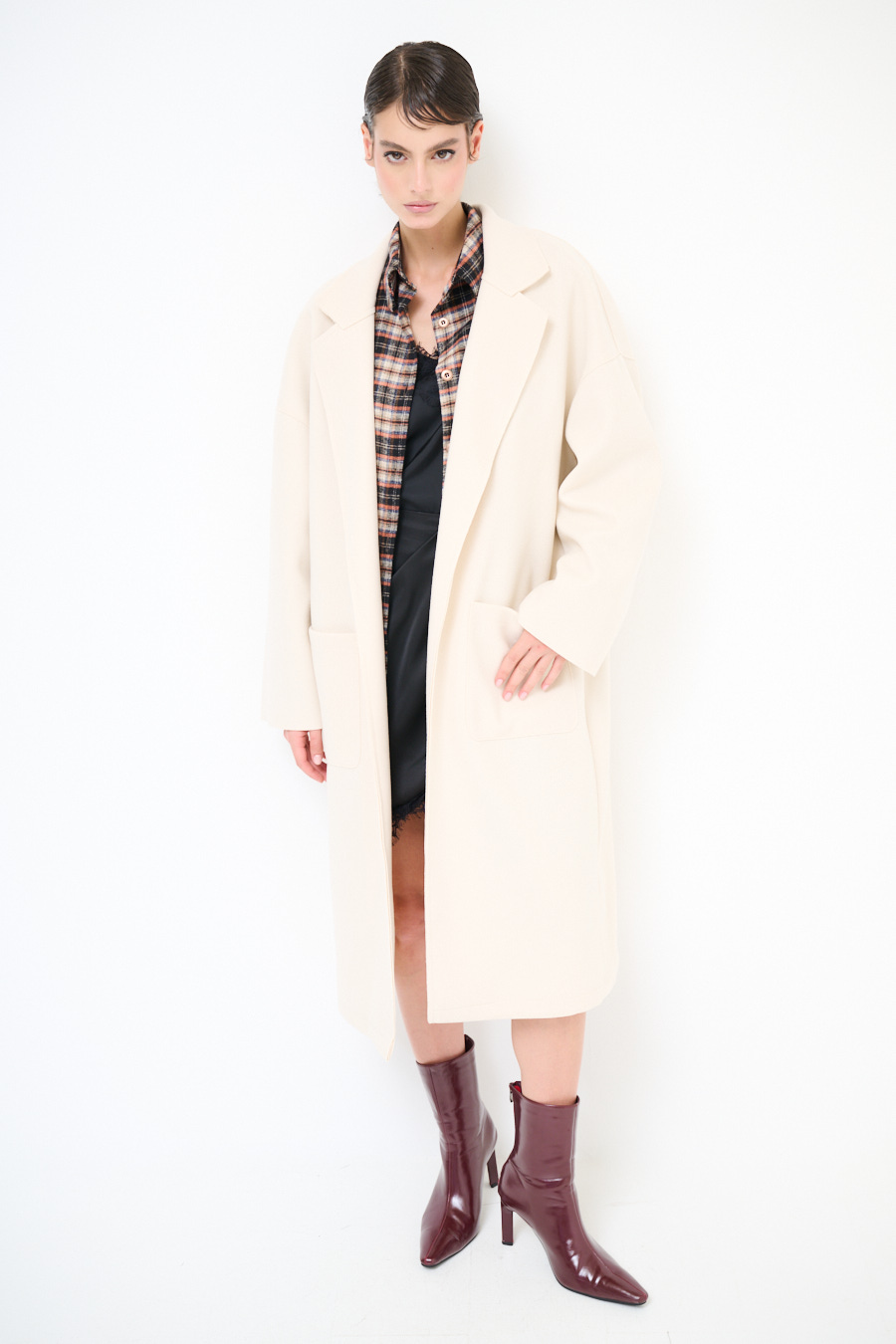 Cappotto in panno pesante con ampie tasche frontali, senza bottoni, collo rever e sfoderato internamente.