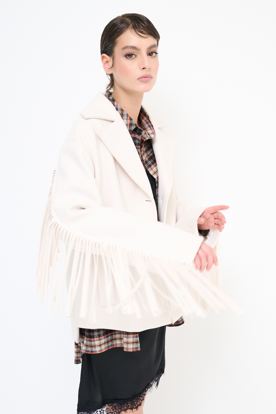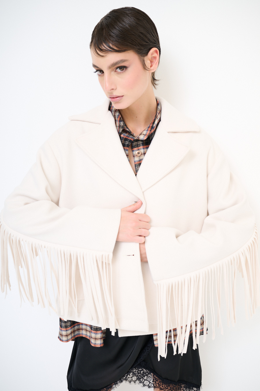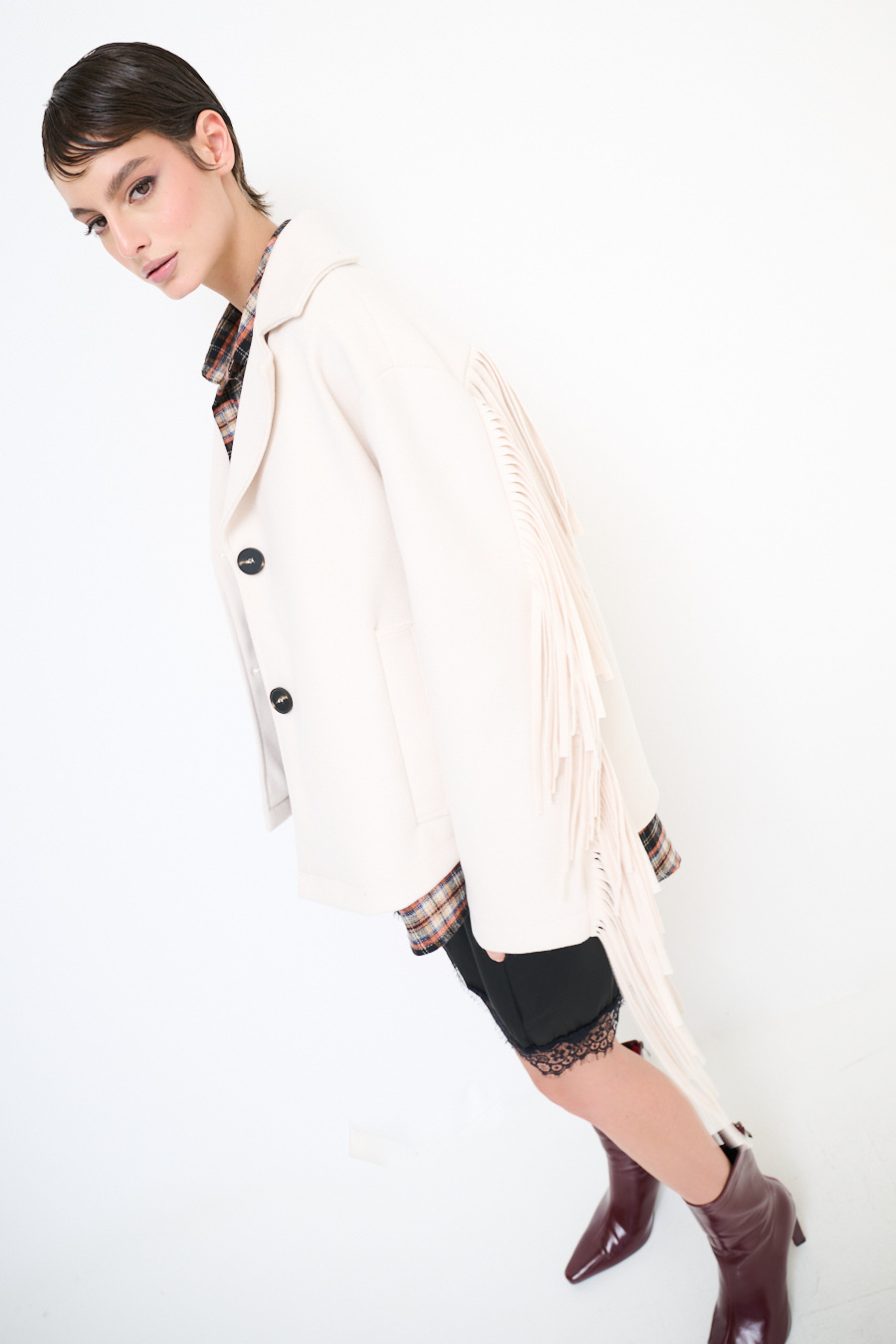 Cappottino corto con abbottonatura frontale, collo rever ampio, tschini, e frange sulla schiena e retro manica, foderato internamente.