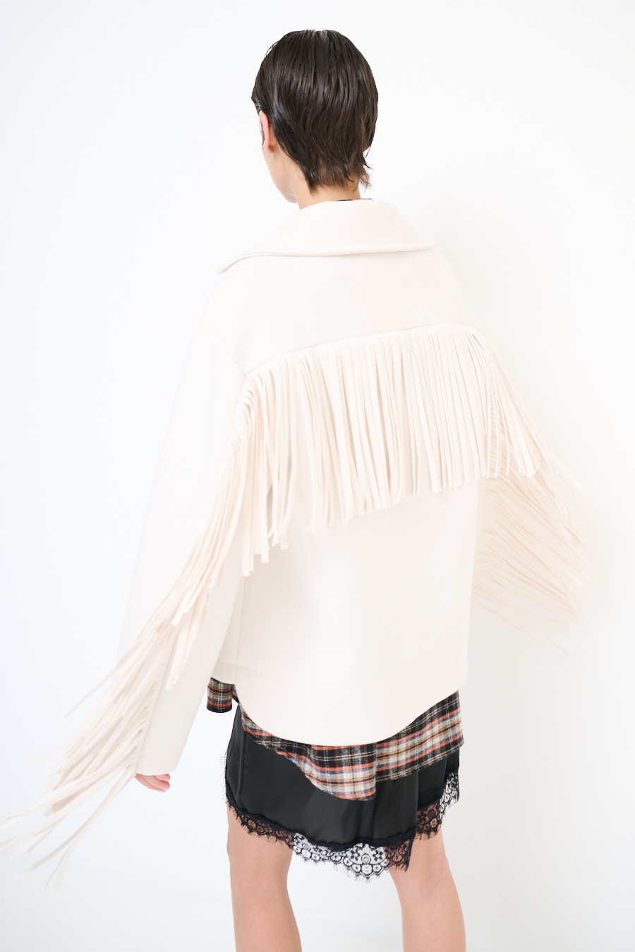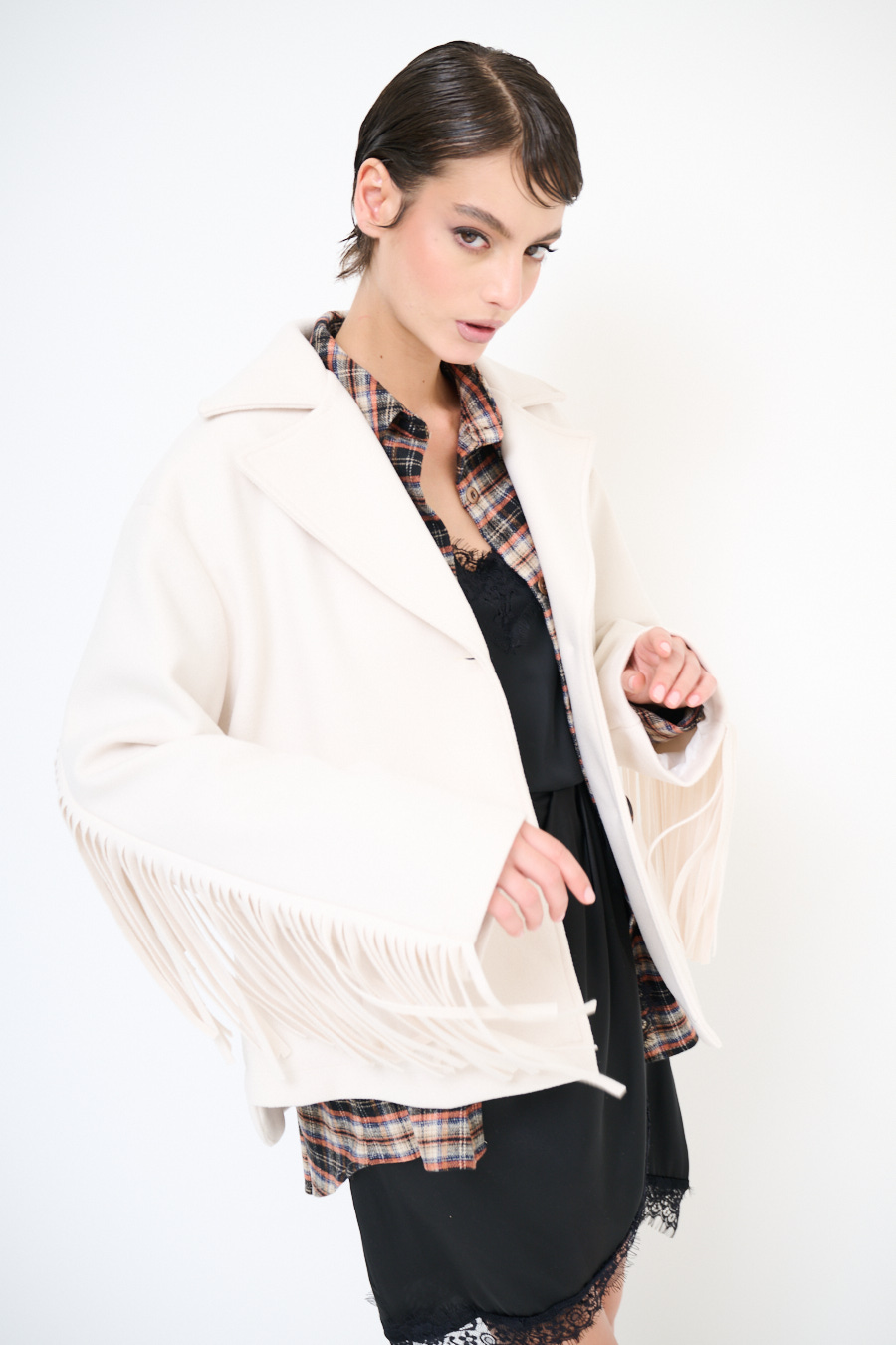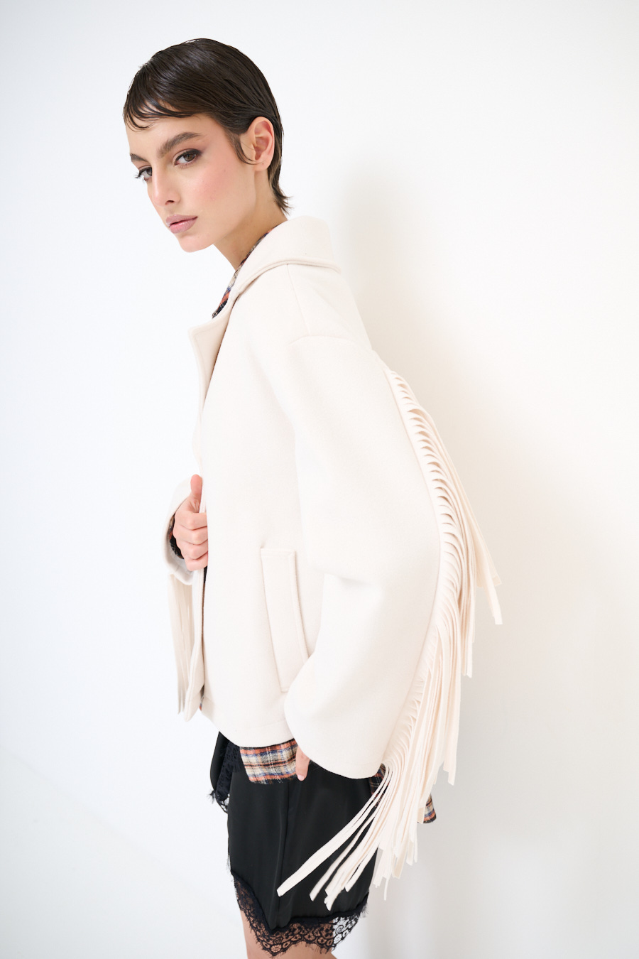 Cappottino corto con abbottonatura frontale, collo rever ampio, tschini, e frange sulla schiena e retro manica, foderato internamente.