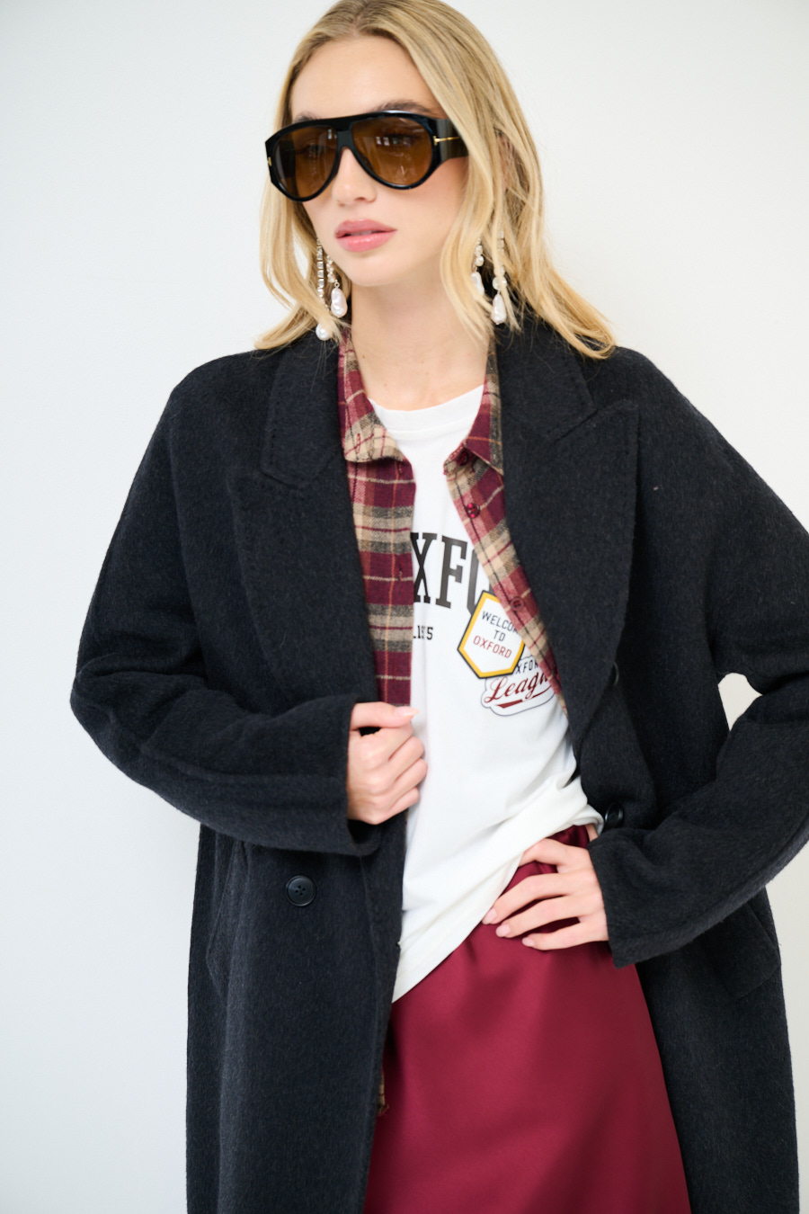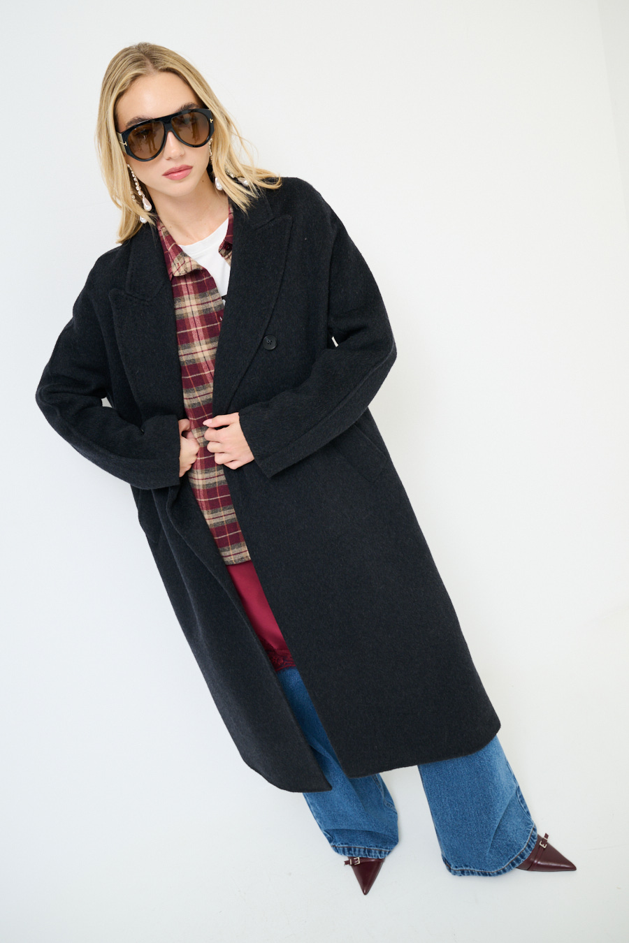 Cappotto misto lana al 70% a doppiopetto, con tasche frontali e ampio collo rever.
