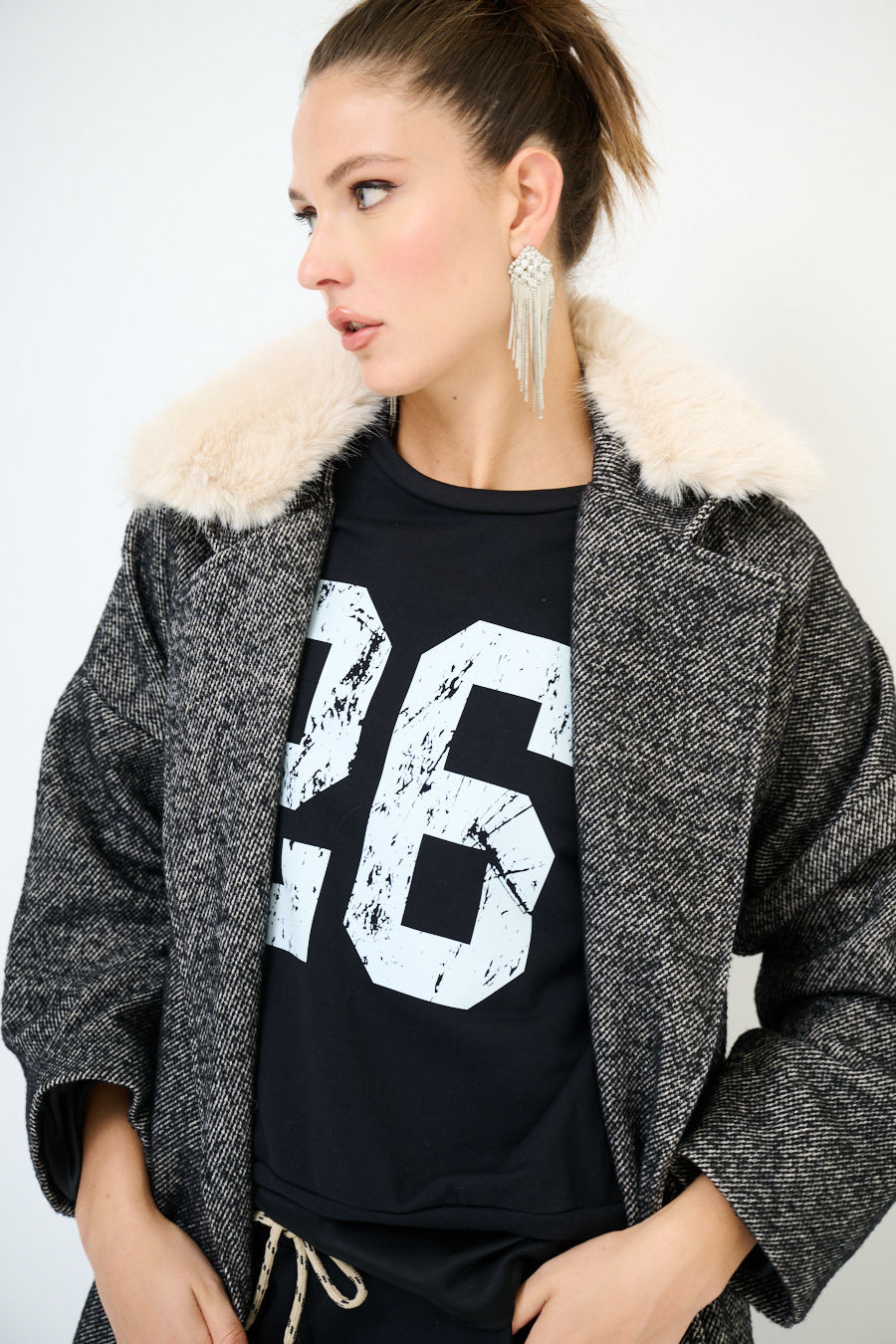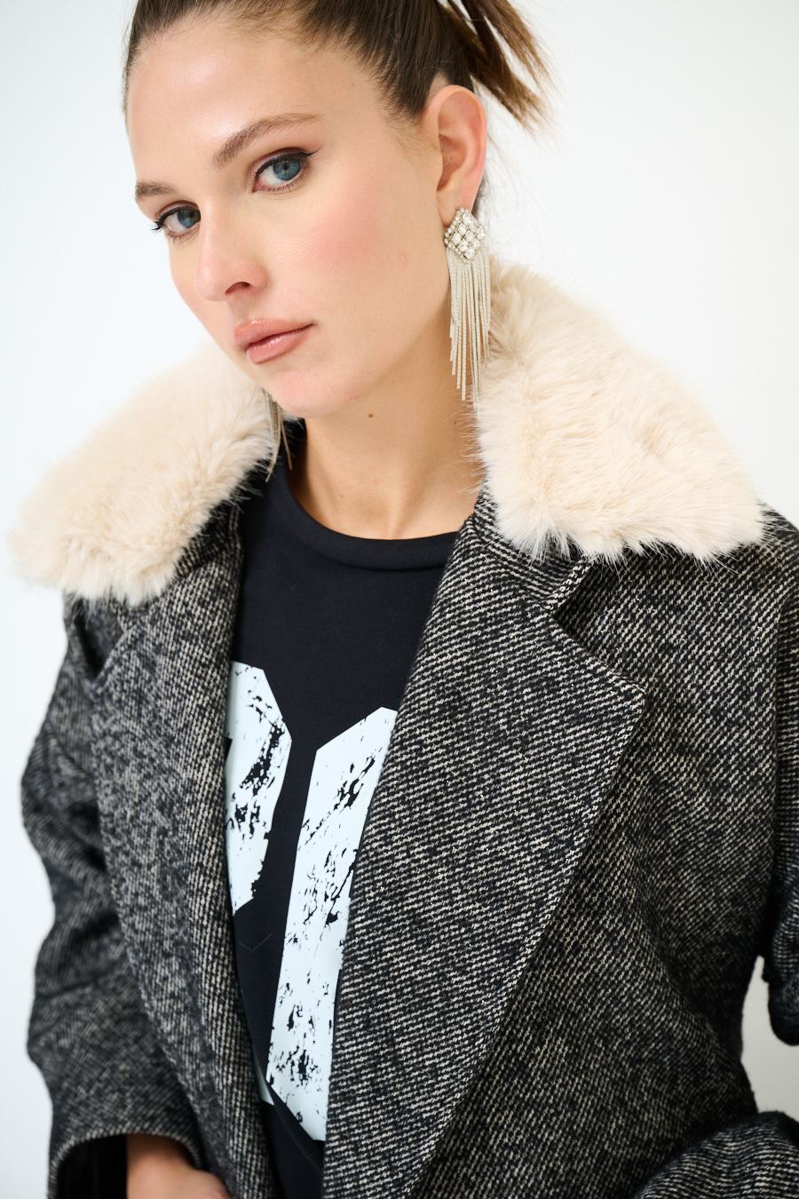 Cappotto lungo modello accappatoio con cintura in vita, effetto sale e pepe e con colletto eco-pelliccia rimovibile, interno foderato e chiusura senza bottoni.