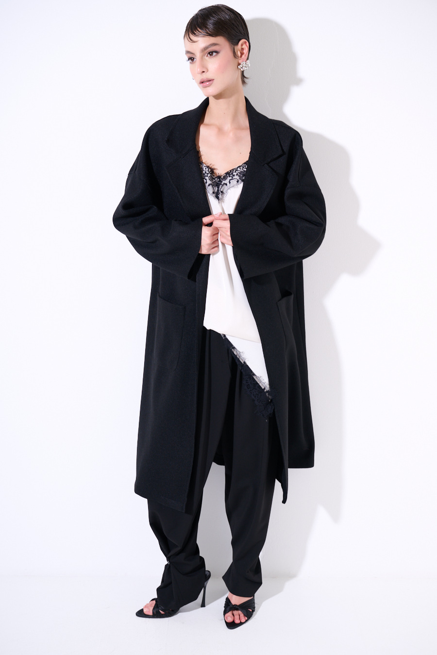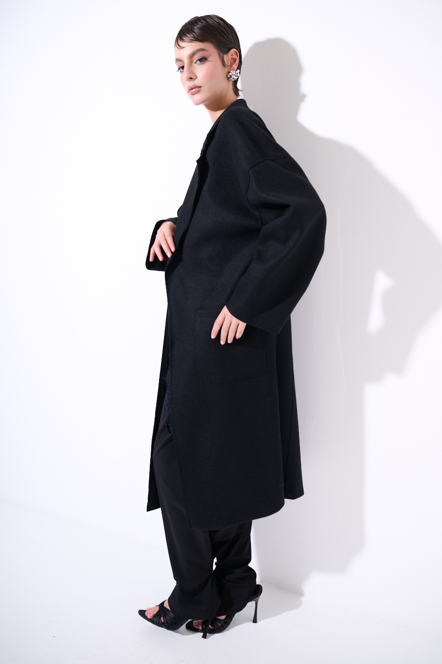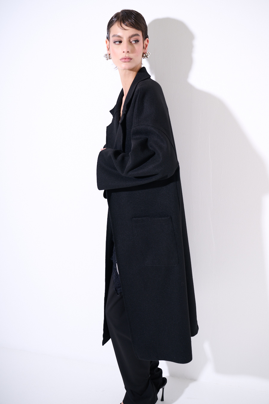 Cappotto in panno pesante con ampie tasche frontali, senza bottoni, collo rever e sfoderato internamente.