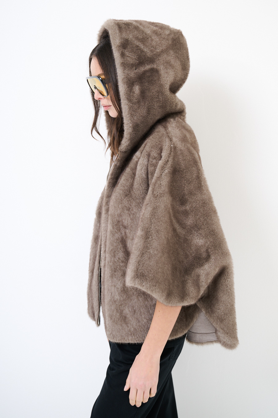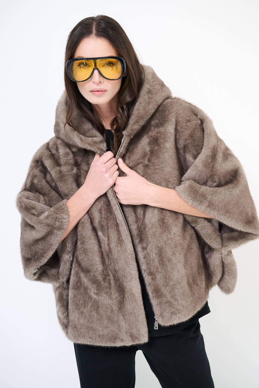 Eco-pelliccia poncho con cappuccio con chiusura a zip e tasche.