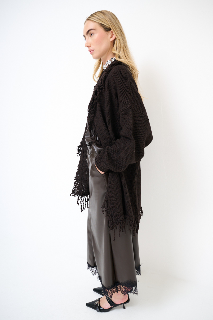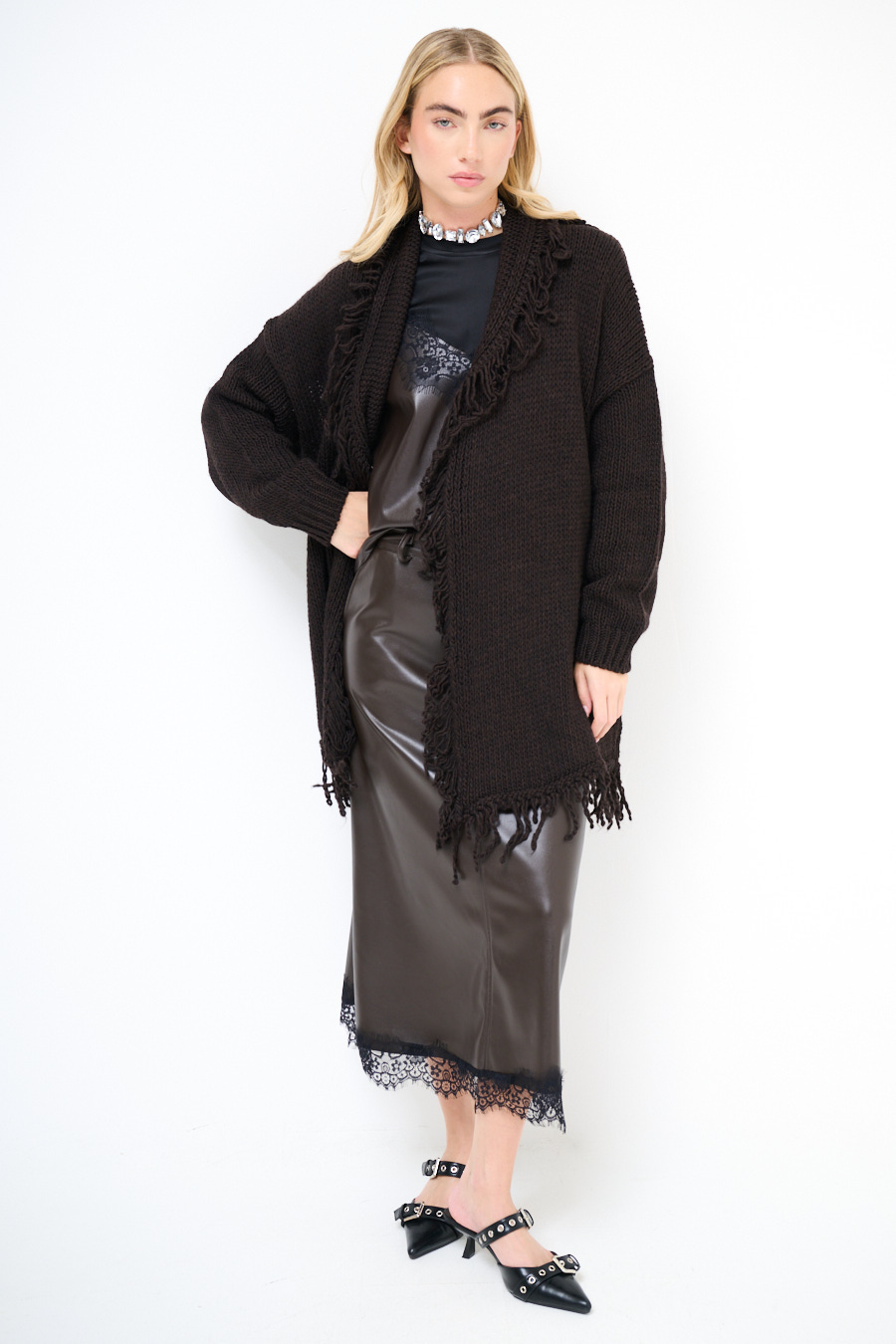 Cardogan aperto oversize a maglia larga con frange sul collo e fondo, con cintura in vita.