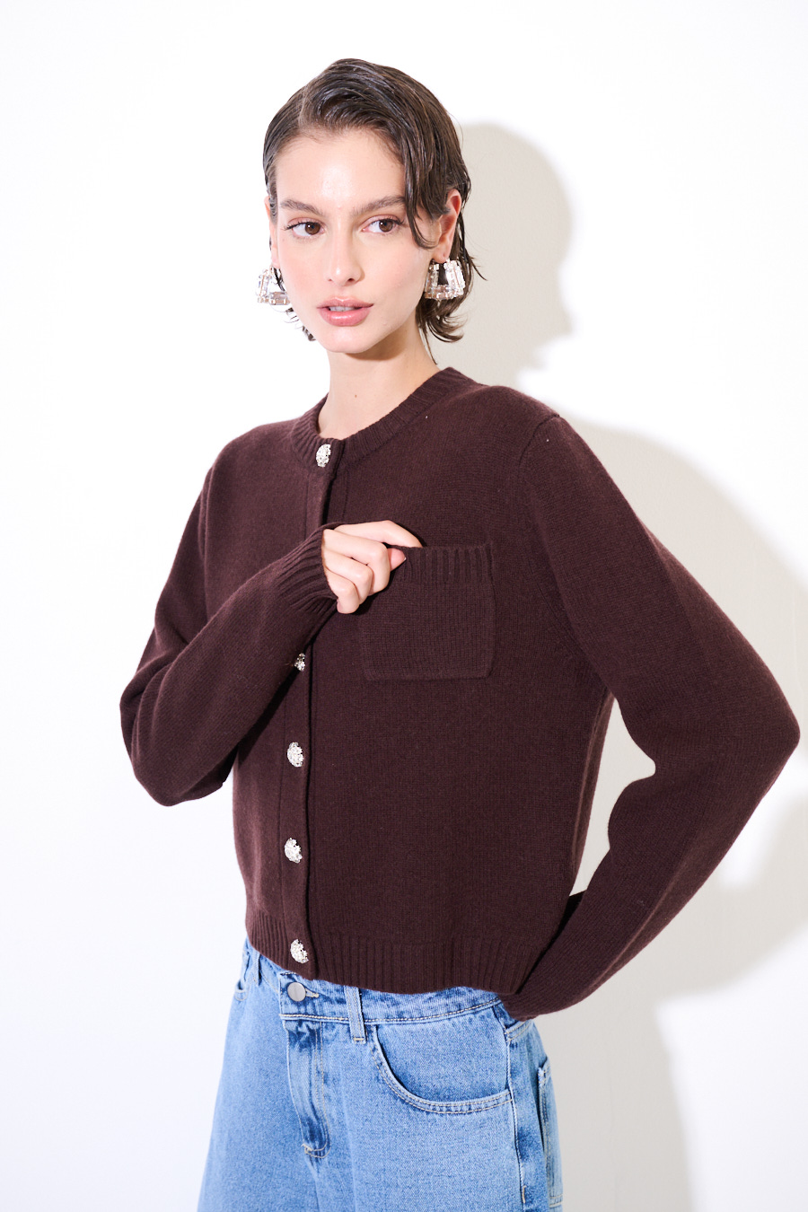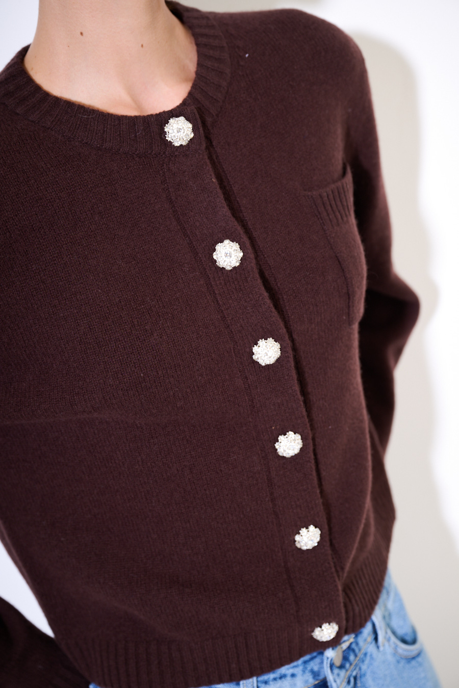 Cardigan con taschino e bottoni gioiello in misto cashmere.
