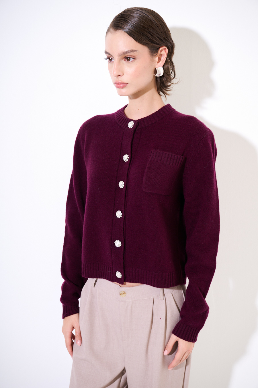 Cardigan con taschino e bottoni gioiello in misto cashmere.
