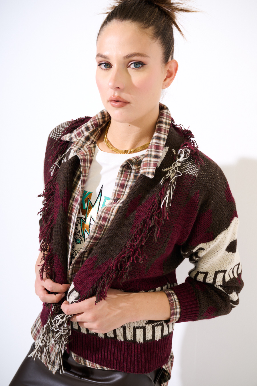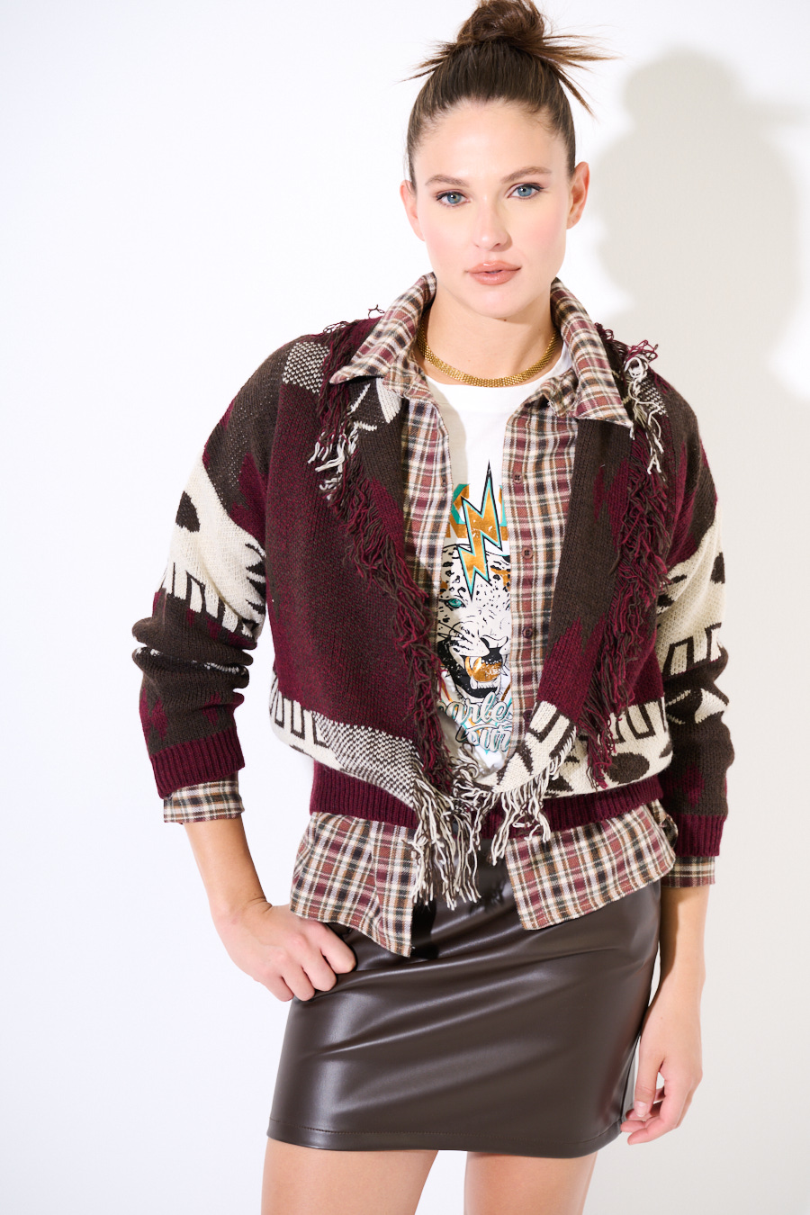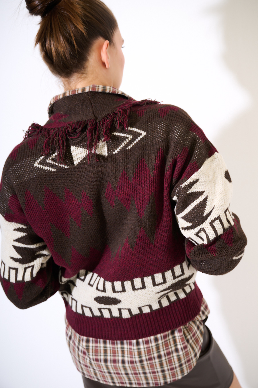 CARDIGAN CORTO CON FRANGE DIS. ETNICO VINO