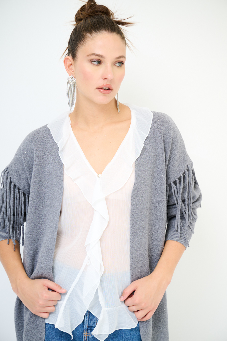 Cardigan con micro paillettes oversize aperto con frange intorno alle maniche.