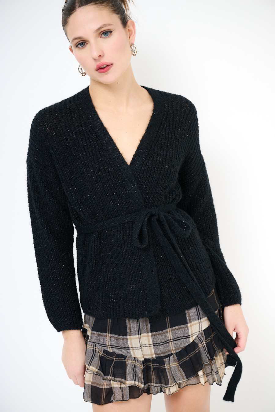 Cardigan con incrocio a kimono, con spalla calata e con filo lurex con cintura.