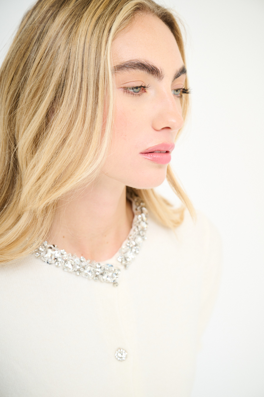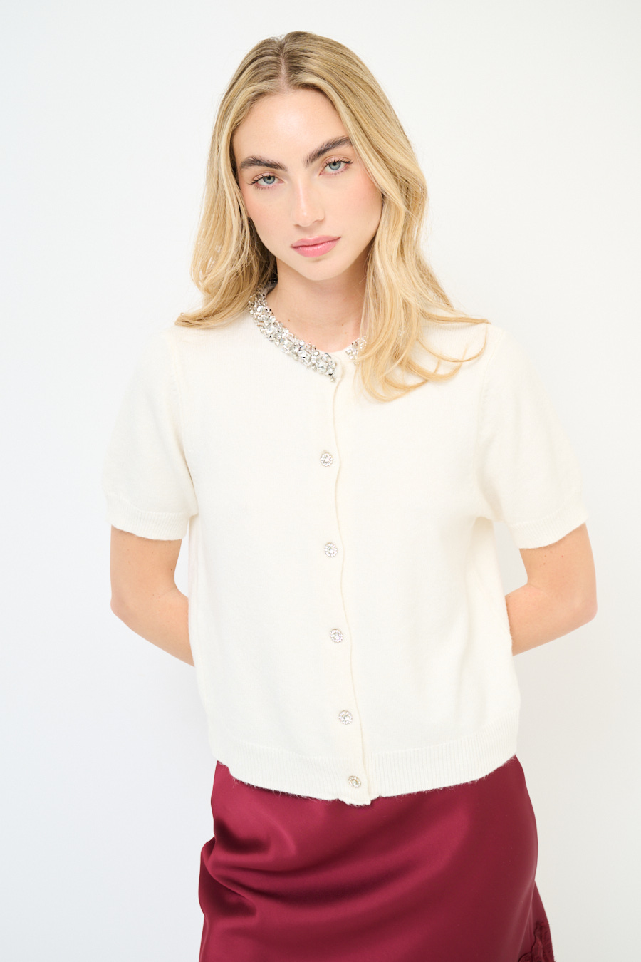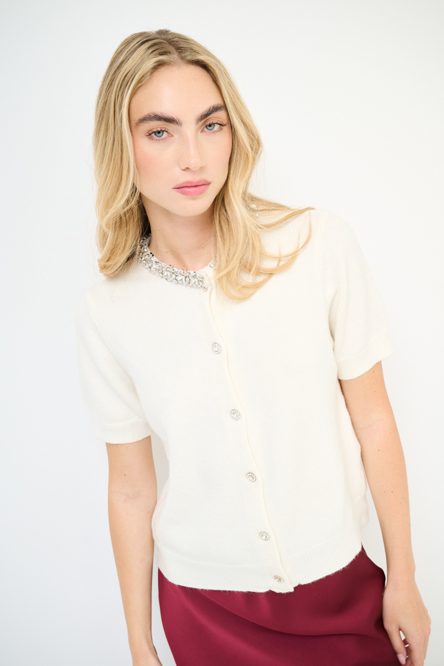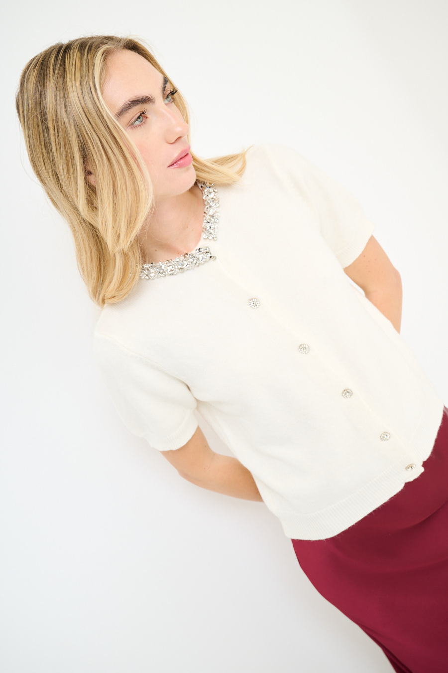 Cardigan con bottoni gioiello e colletto con applicazione strass, con manica corta.
