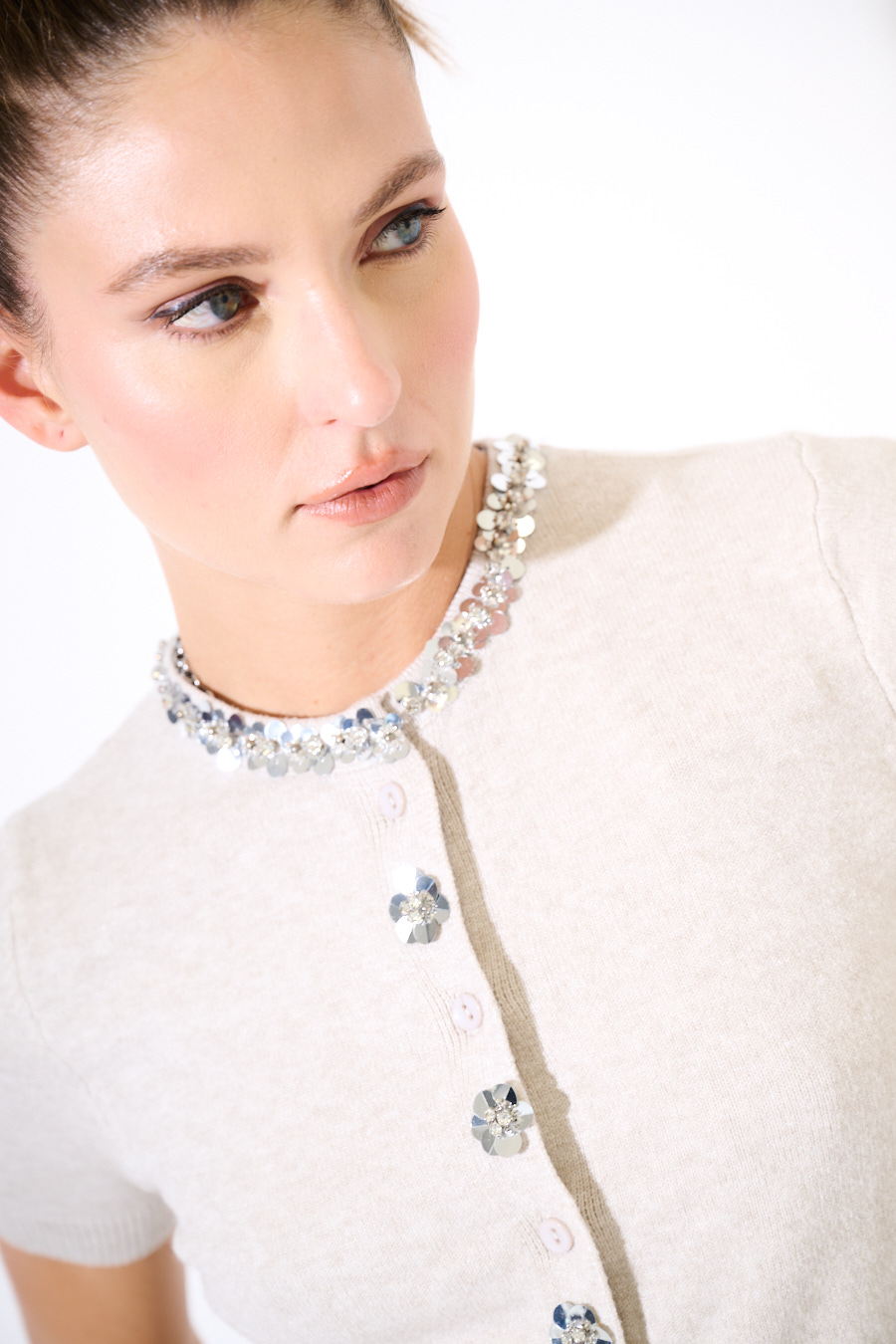 Cardigan a mezza manica con micro paillettes e bottoni gioiello e con applicazione intorno al girocollo.