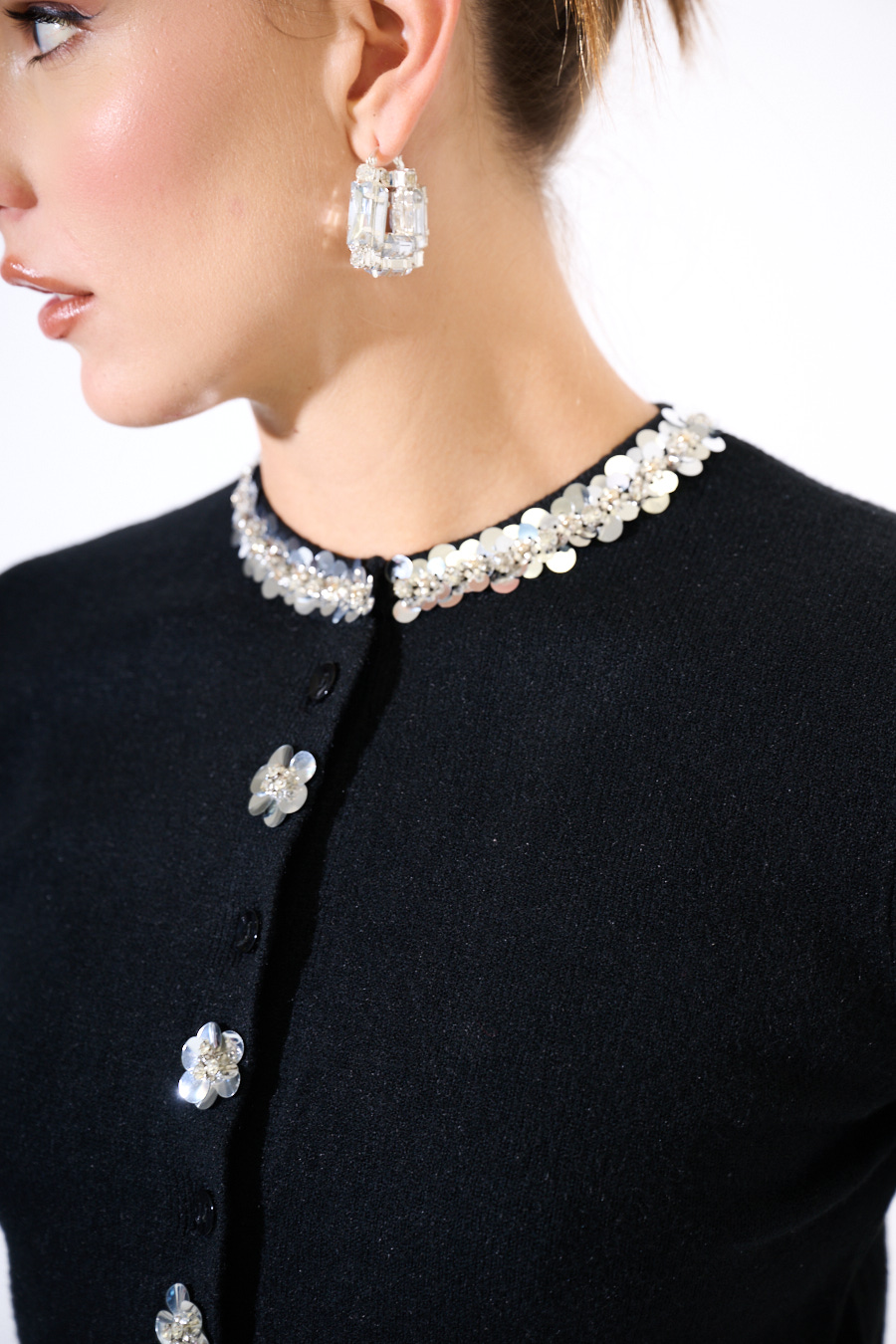 Cardigan a mezza manica con micro paillettes e bottoni gioiello e con applicazione intorno al girocollo.