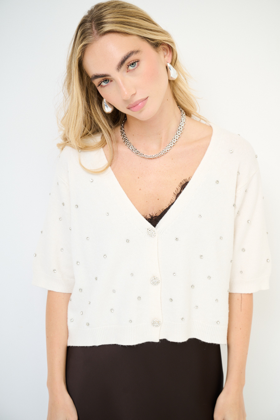 Cardigan con mezza manica e bottoni gioiello, applicazioni strass all over.