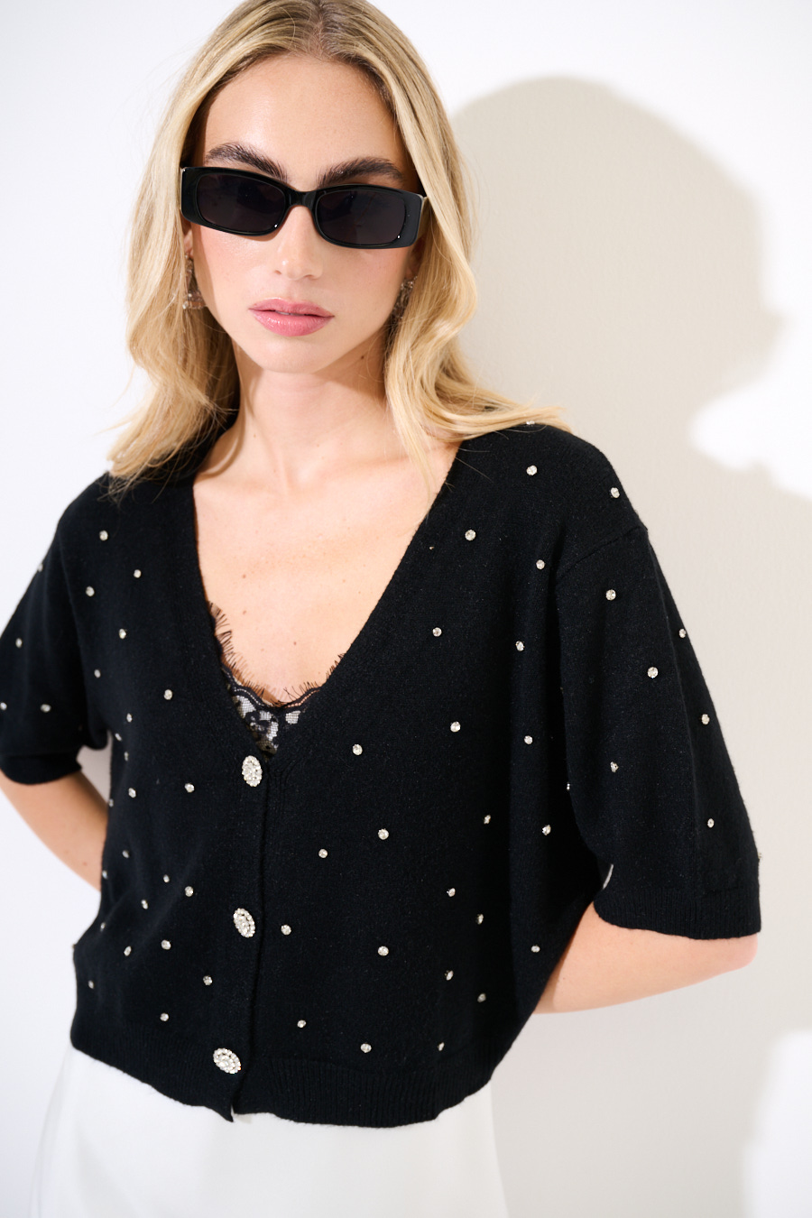 Cardigan con mezza manica e bottoni gioiello, applicazioni strass all over.